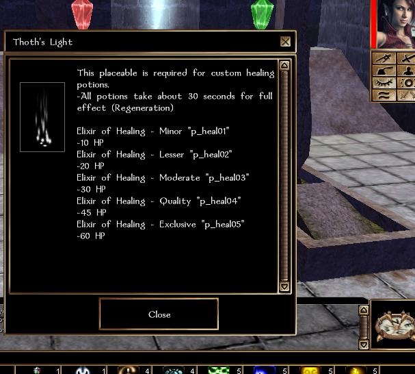 The healing potions are meant to be replacements for bioware ones... though builders will need to manually remove all old ones if they wish to do this. They heal over time(30 seconds) changing how characters will depend on Healing, especially in battle.