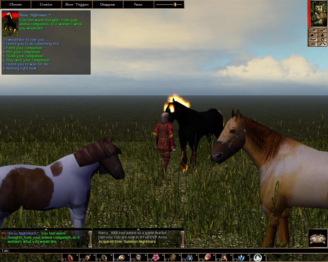 Feb 2007 I am adding my pack animal system with the saddlebag persistant storage. There is a pack: Camel, Horse, Pony, and Ox. These are full henchmen with Animal companion type interface.