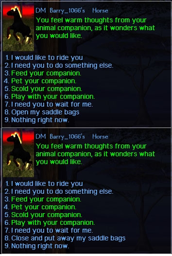 You will find all this, modified to work seamlessly with DLA/Bioware horses, using the Bioware radial menu packaged in CEP 2.1. Special functions were written by Bioware to allow CEP horses to coexist and work seamlessly with the DLA horse.