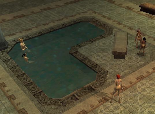 This is an area containing a public bathhouse that might be found in a large city. It contains separate facilities for men and women. You cannot enter the facility designated for the opposite gender. Each facility is essentially identical, containing a bathing area and a steam bath. Entering the bath will cast cure minor wounds on the character, and sitting on the empty bench in the steam room will cast Restoration on the character.