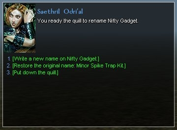 You can obtain a Naming Quill either by spawning it (tk_itemnamer) through the console or by using the module I've included. To get it from the module, unzip NamingQuill_TK_module.zip into your modules directory, then go into this module with your character, pick up the Quill, save your character, and quit. I've even marked this Quill as identified for you.