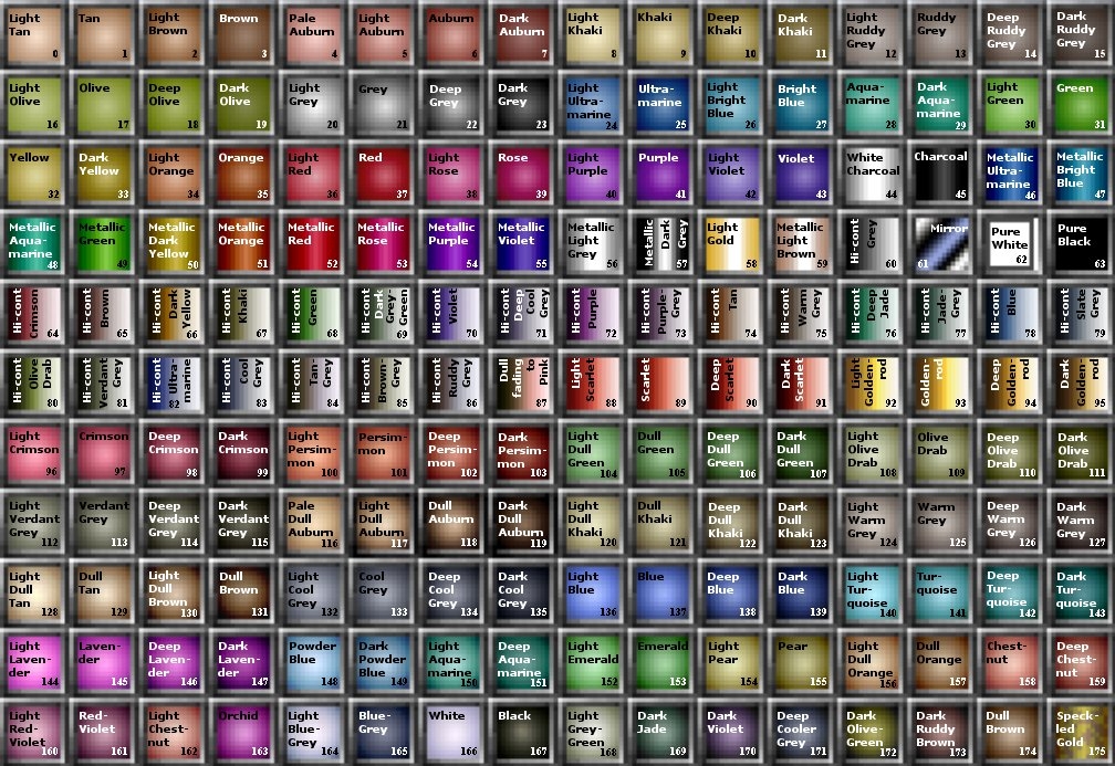 The images with this entry are guides to the color names used by Omnidye. The text file gives conversions between the standard BioWare dyes and the names used by Omnidye.