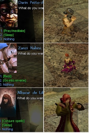 Esses scripts personalizam as anima��es e op��es de rest, de acordo com a ra�a e classe de cada jogador. O player agora tem duas op��es: uma a��o de 'recarga r�pida' diferente para cada classe, e uma a��o de dormir (reverie para os elfos). Veja a figura para um exemplo mais simples =) This scripts customizes the resting choices and animations to meet the race and class of each resting player. The player is now given two choices: a quick 'skill-reload' action, different for each class, and a full sleeping action, or reverie if you're an elf. See the full picture for an easier example =) Note: I made it the simplest and smallest I could, so the script does not use persistant data saving. If you want it and don't know how to do, feel free to e-mail me =)