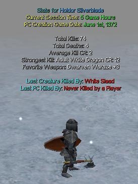 Wow, it worked perfect. Very ingenious I must say. I actually turned off the entire game and turned it back on and recent stats were still there. I think I�ll use this in my module, so far I got Lilac Soul and now Invizible420 to give credit too. I think I�ll make a hall of commemoration in my PW I�m making. Most of all it seems easy and can be done anware in the game and looks easy to read, I recomend this one. Well done. Keep up the good work.