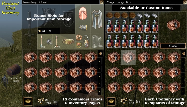NOTE: Aerisarn has created a version of our Portable Persistent Chest that requires NWNX/APS to work and is optimized to reduce lag on chest retrieving by substituting a whole area objects cycle with a GetObjectByTag cycle (so don't change the creature tag :-). Other minors cleanups on chest dialog. Hope you enjoy, the rar has both new erf and module and the original readme (no change to the interface). Check it out here.