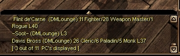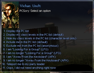 The PC Scrying device is an inventory item that displays a list of all non-anonymous PC's online including their Name, Area, LFG, AFK and Levels. PC Scry is intended to assist grouping in multi-player games. It has been updated from Scott Thorne's origional version to include both expansion's prestige classes.