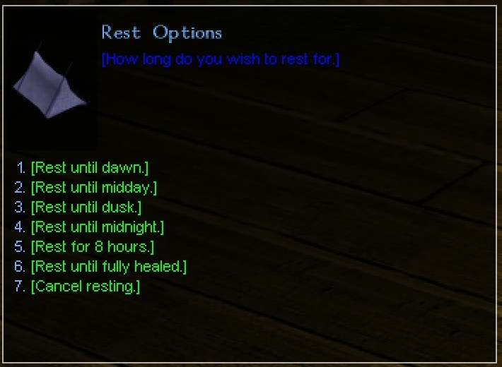 This is the custom resting system that I used for Red Moon Rising. It is a simple but effective system that does away with these instant full healings that occur through default BW resting. The player is presented with an options box, similar to that in Baldur's Gate, and can pick the resting duration. Hitpoints are healed at a certain rate, lending more realism to recuperation and time is also passed during resting phases.