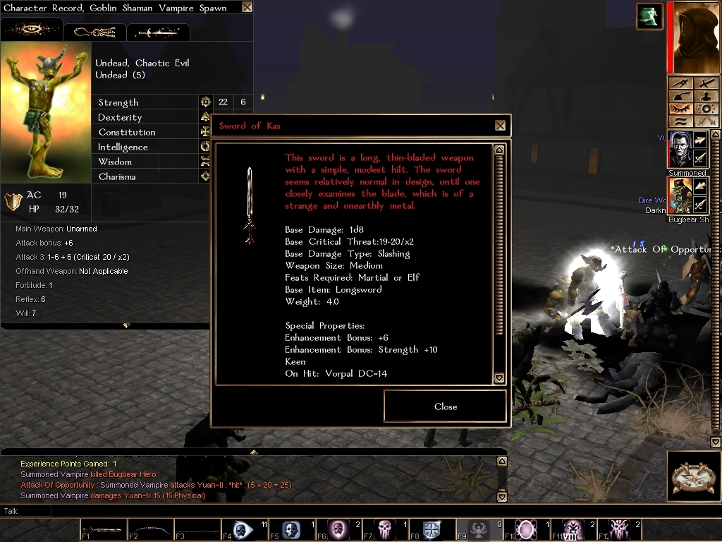 Players: Extract override files and load Demo Module, and save your character with the spawning weapons for later use. The override version will work for standard single-player mode, (with the bonus effects of more verbally active combatants, and a higher henchman limit.), simply load and enjoy neverwinter with your new undead army!