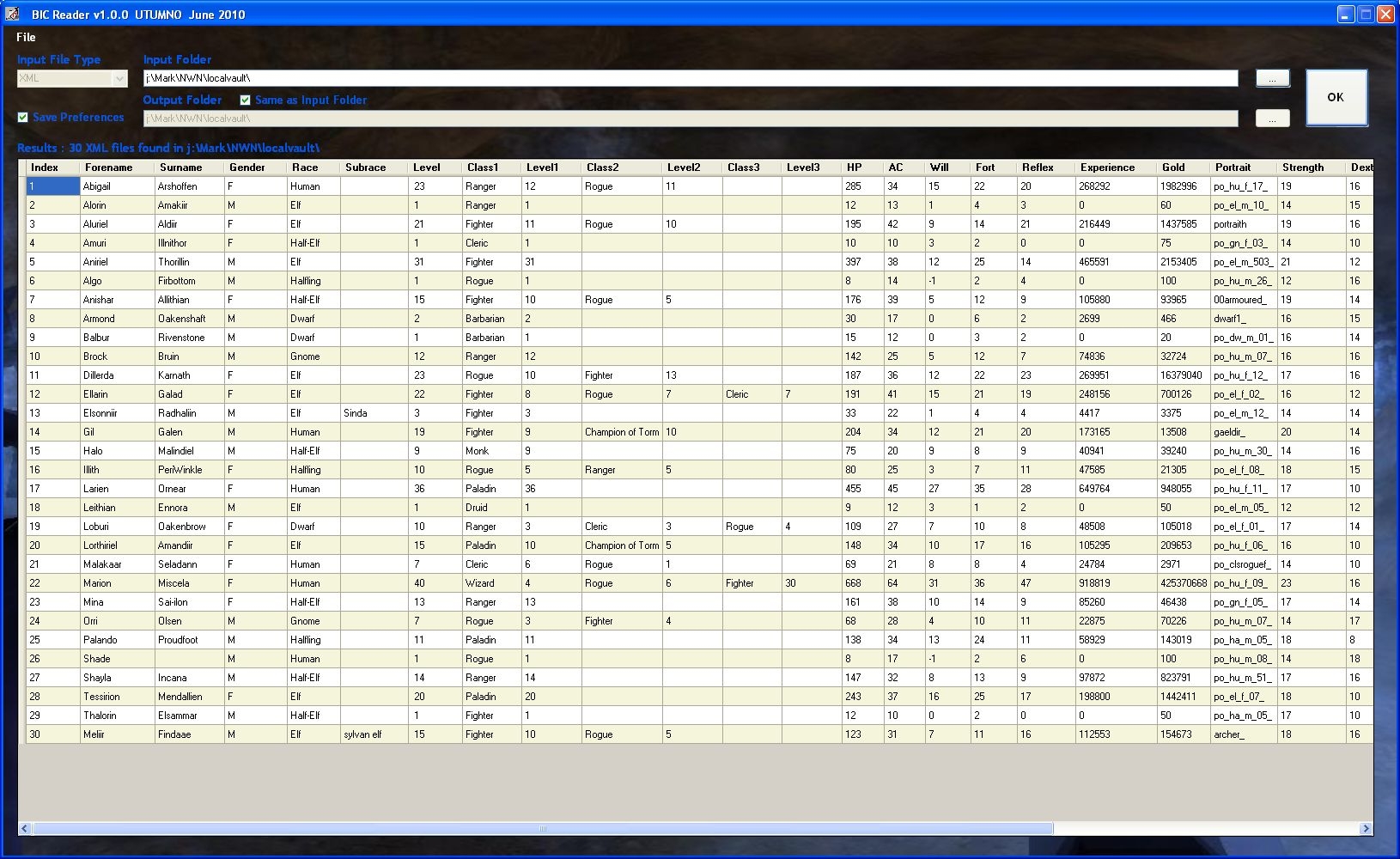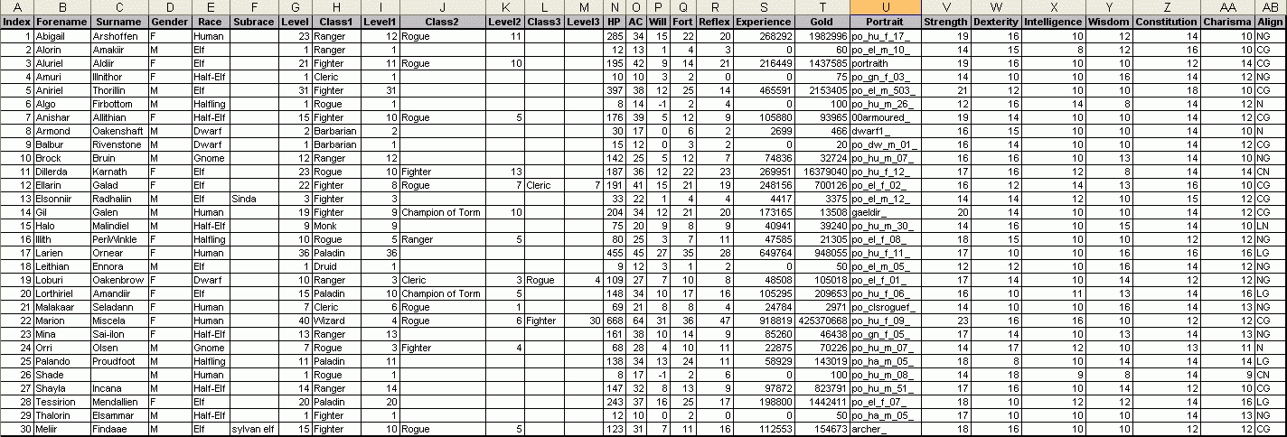 A small VB.NET application which reads XML Character files (i.e. BIC files exported from Leto) and produces a Character list - see screenshots. The list can then be output to .xlsx or .csv format.