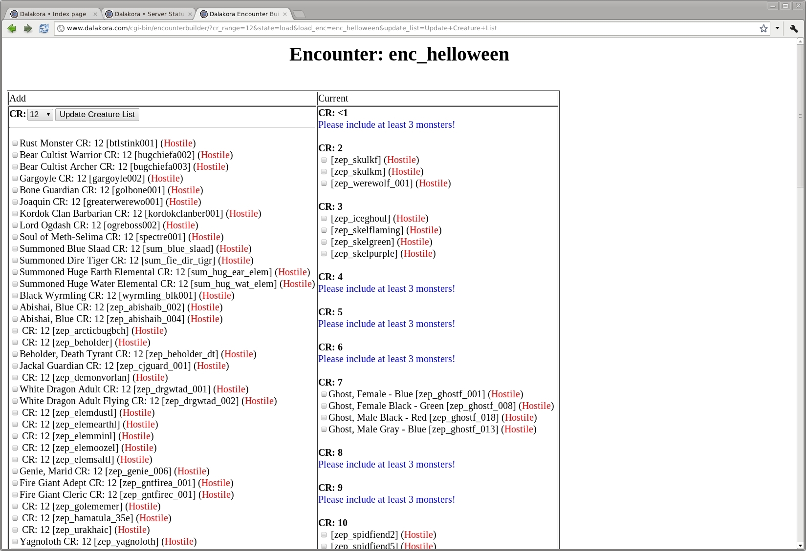 then, i just paint down some triggers or other situations to spawn the "encounter". the game will access the mysql database, look up the named encounter from the cgi page, and spawn the appropriate number of creatures randomly selected from the list.
