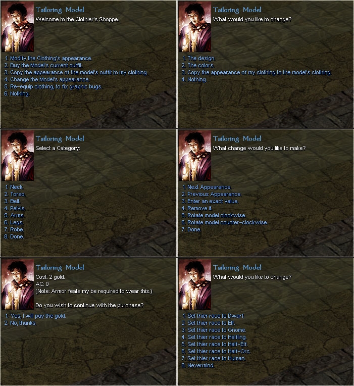 Using the Tailoring Models, anyone can modify or create clothing. The Tailoring Models can use any clothing model included in your module through HAK pack, and remove the blank entries that make the Crafting Skills difficult to use. It does this through cached 2DA reads of the parts_###.2da files. The Tailoring Models can also copy the appearance of clothing you have created to your current armor, if the base AC matches.