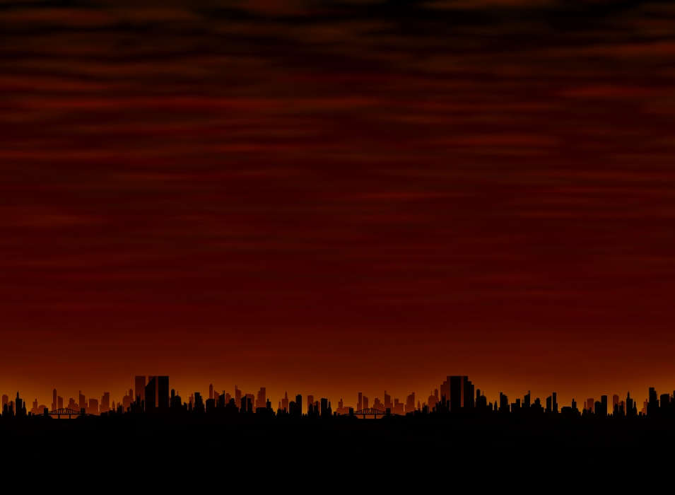 A dry baron landscape, the cracked earth under your feet with the occasional sand and dust clouds. A large city on the horizon silhouetting the red skies.