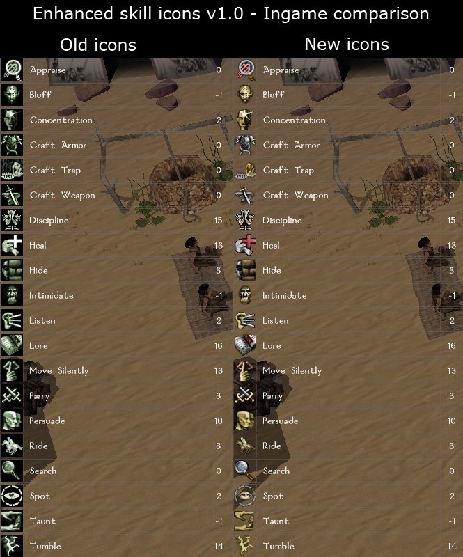 The package include skill icons for NWN, SoU, HotU and 1.69. The icons were all colorized and a alpha layer was added making their background transparent. They're now easier to find and so much more beautiful.