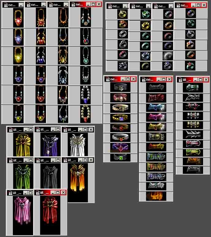 This is a collection of TGA pictures for use in creating new items in NWN. To make these available for use in the Aurora Toolset, put them into your Override directory. After making any items with these pictures, you will need to include the appropriate TGA files in the Hak Pack for any module using those items. This pack contains: 24 Ring graphics, 24 Necklace/Amulet graphics, 8 Belt graphics, 12 Glove/Gauntlet graphics, 10 Bracer graphics, and 8 Cloak graphics. For more information, please see the included readme file.