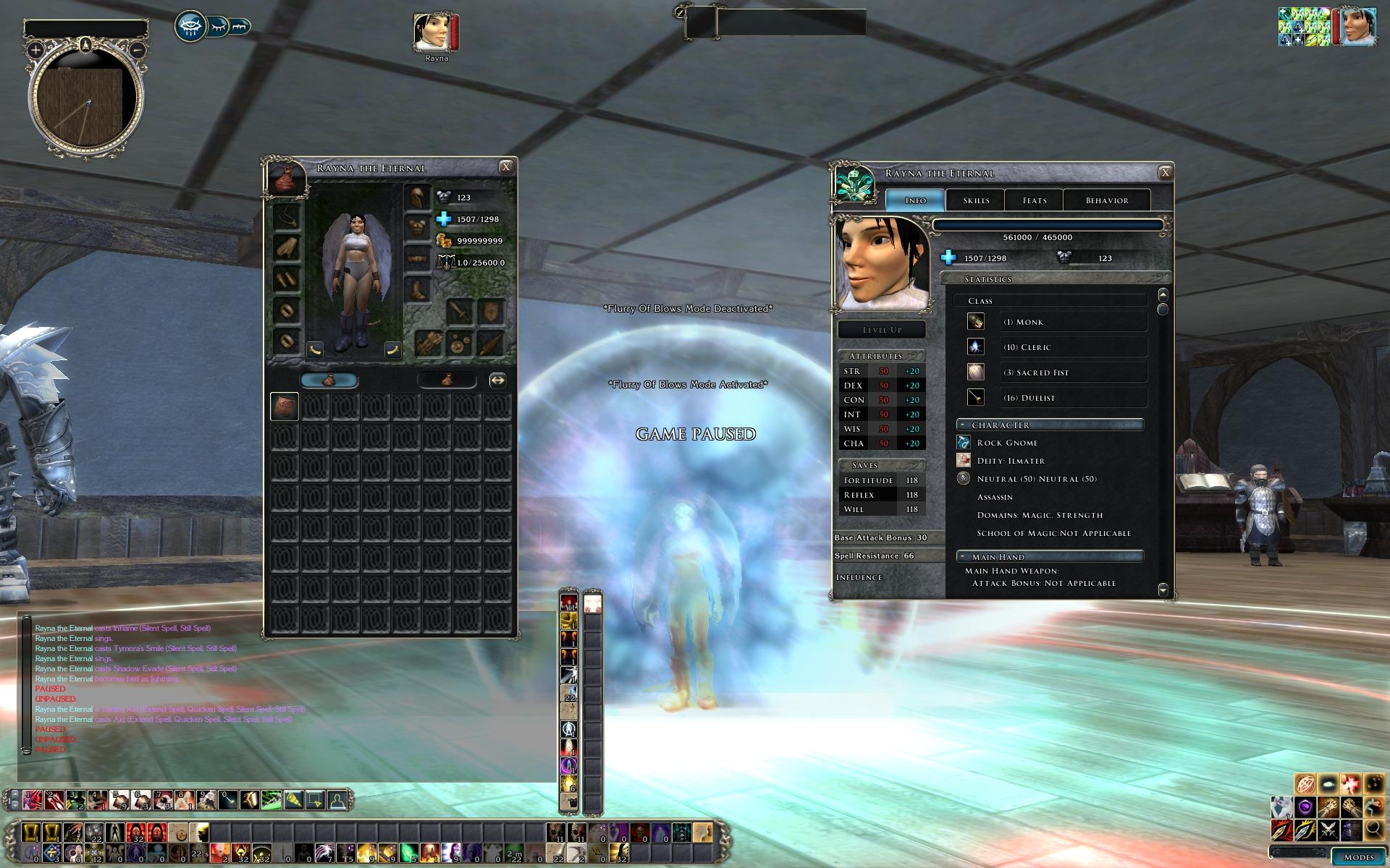 When fully buffed, Rayna has 123 AC, 75 AB, 1507/1298 HP and all saves at 118. With Flurry of blows and haste activated, she hits 9 times each round.
