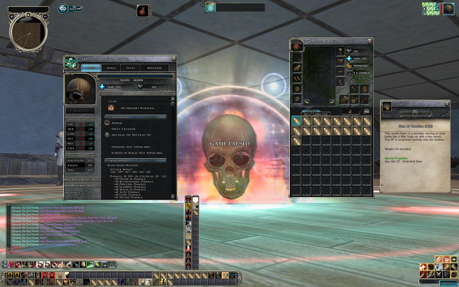 Further, Abraxas has all relevant class/race specific buffs at his disposal, allowing him to reach 103 AC, 121 AB, 1448/1291 health, all saves at 100 or more, and 7 attacks per round that deal nearly as much damage as his breath weapon (but subject to full AC, rather than just touch AC).