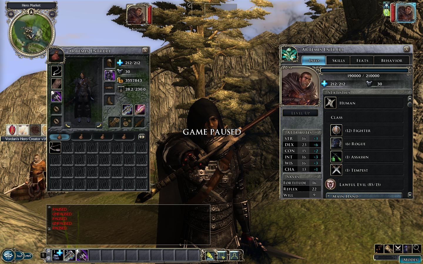 Artemis Entreri with all his equipment at level 18 (Fighter12/Rogue4/Ranger1/Assasin1). Any extra items equipped with Artemis is purely aesthetic. Statistics adhere to official stats as closely as possible.
