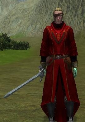 He comes with the magical items that I mentioned previously, as well as his mighty sword Traitor... and the armor and eye patch that made him famous as the Prince in the Scarlet Robe. I have based his stats off of the information contained the Corum sourcebook for the PnP game Stormbringer, and I had to change the "Hand of Kwyll" to Hands of Kwyll, since in Nwn2 you can't have just one gauntlet, they come in pairs.