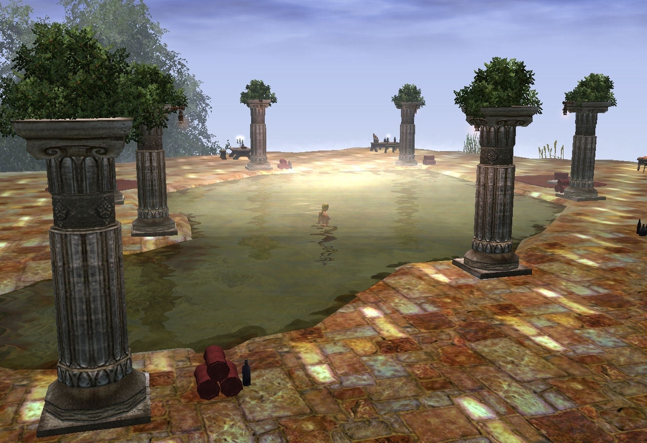 Our local vault server allows you to bring your fully-realized and customized character. Custom clothing, armor, and weapons are available, as well as leveling, for those who do not wish to customize their character prior to entering. Our scripted emote system allows bending over, kneeling, and lounging on the floor in addition to the usual emotes. Our Master/slave system allows forced emotes and binding to equipment. Beds are walkable and layable. Play as a rich resort guest, a resort or private slave, or a carefree immortal nymph or faun.