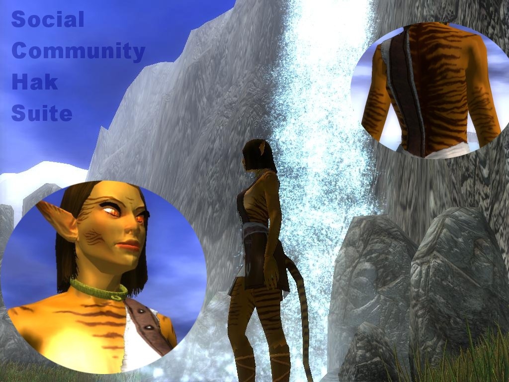 These haks are meant to be shared by persistent worlds under the social tab. They contain a very complete selection of all the clothing options and head and hair options available, as well as selected weapons, creatures, tilesets, placeables, and spell effects. The social haks will be maintained and updated, with better version control than I usually bother with.