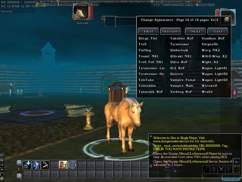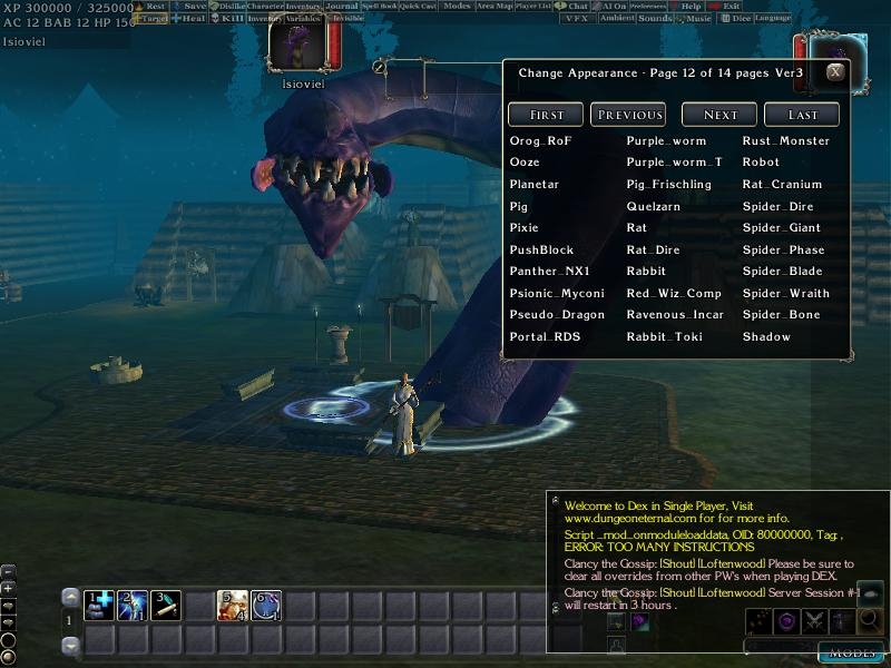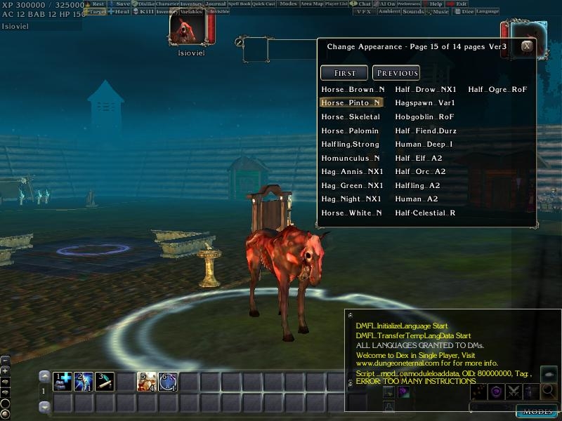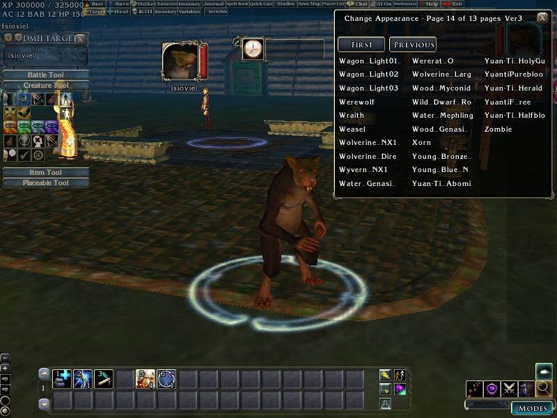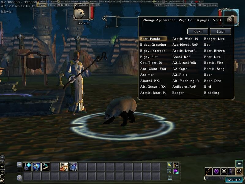 5) Comes with a integration to my Script library and a custom appearance.2da. Creatures have a custom set of constants which do not have incorrect entries and fluff from NWN1. This includes functions to get a creatures height, to flip a creatures sex ( based on 2drunk's work ), to iterate creatures ( Next Appearance, Previous appearance for DM's ) and to get an appearance name without a 2da Lookup. I've also included many other adjustments, the 1st person camera view, as well as adjusted the size of the selection circle. Added "Hidden_" to creatures which are technically needed but which are of custom use, and "del_" preceding any invalid or missing creatures.