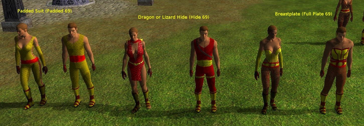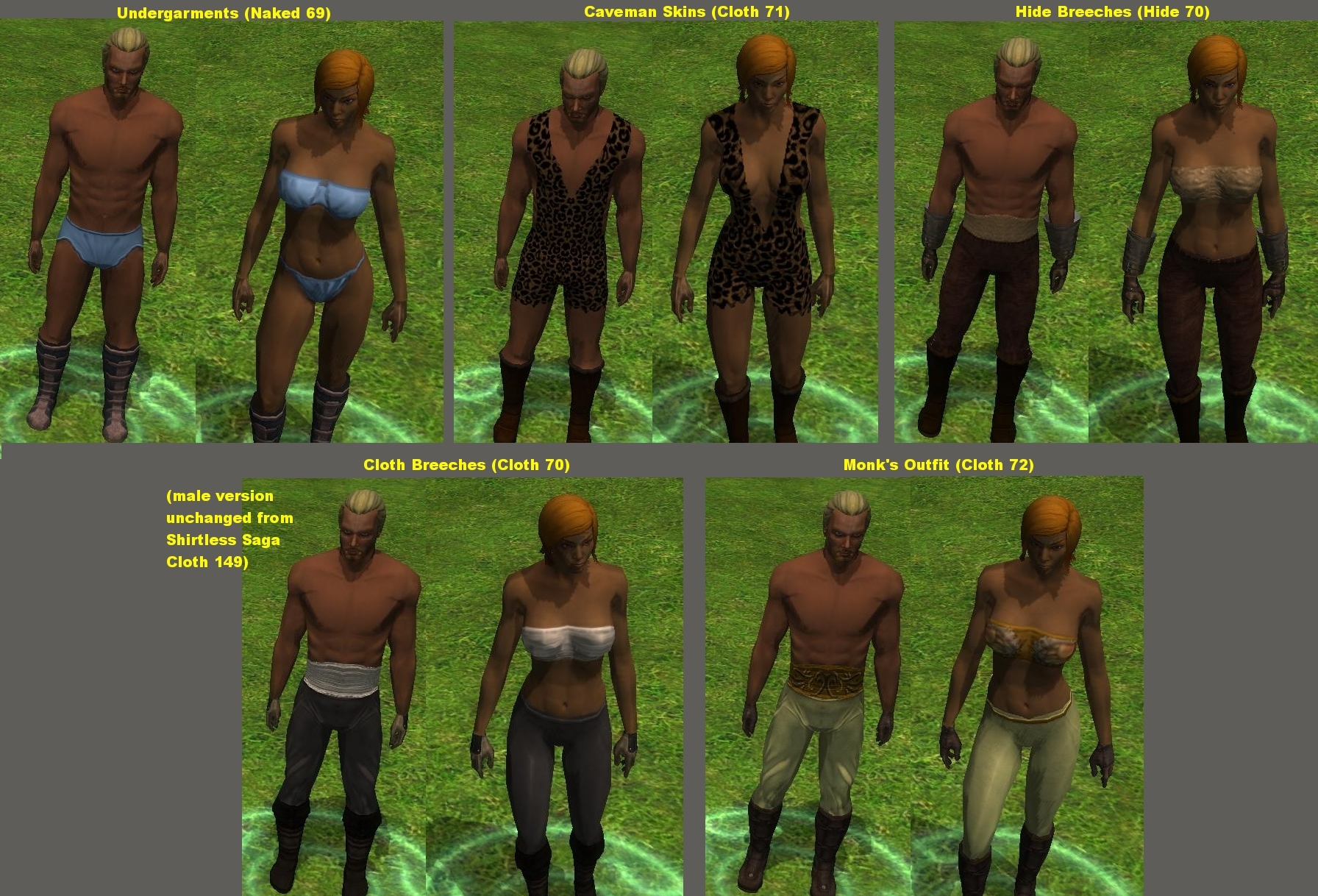 I'm getting more comfortable with retexturing, so most of the Pack 3 female outfits were made directly from Zylch's female nude base, rather than editing Aleanne's designs. Note, however, that male cloth 70 (cloth breeches) is simply a renamed version of the Shirtless Saga's cloth 150, so I deserve no credit for that one.