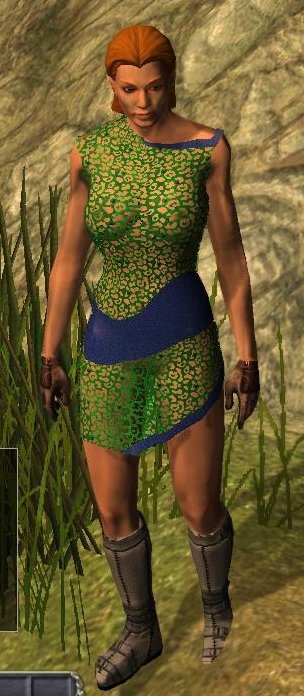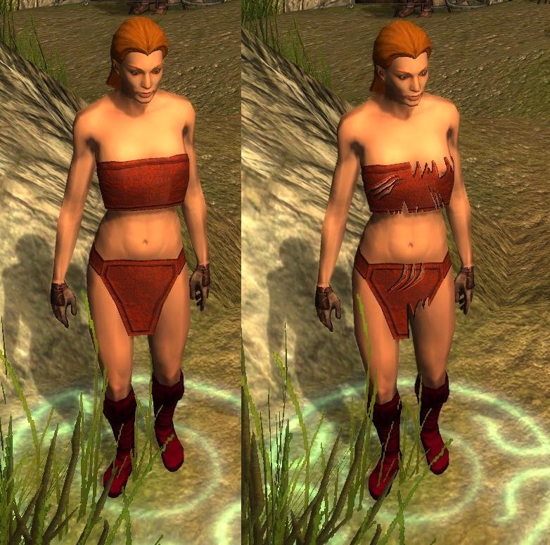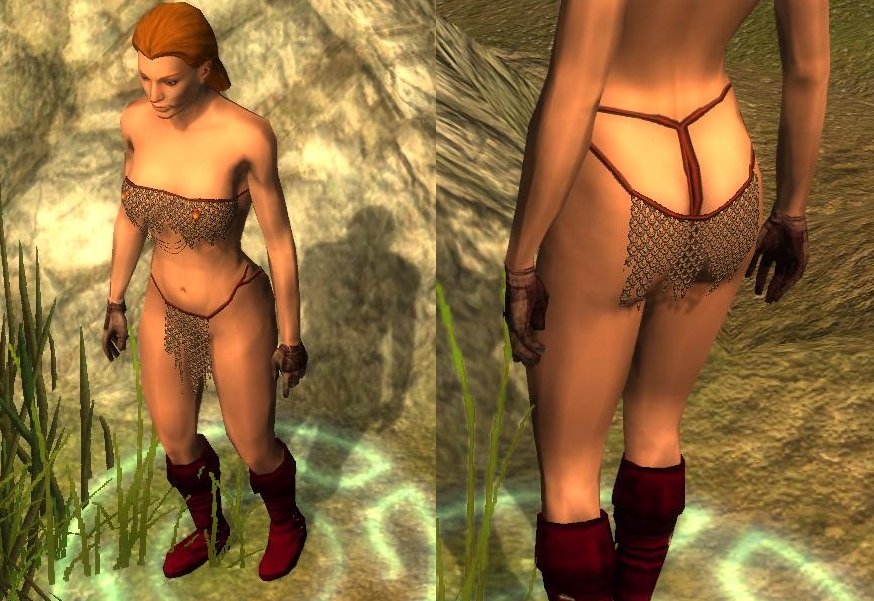 Contains a 'Crop top and loincloth' mesh and a 'Cocktail dress' version. The extra meshes parts are alphaed, so can be used for a wide variety of outfits. UV template included. There is come clipping when the running in the cocktail dress, but it's not to bad. Can't fix it easily. This is a problem that affects many of the armors, so I don't feel to bad about it.