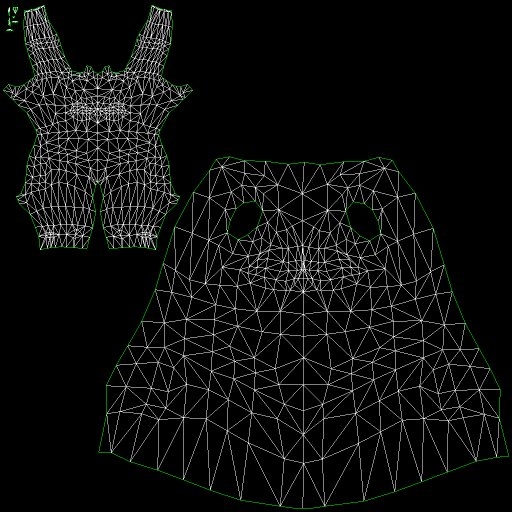The UV coords for each side (inside and outside)of the*bleep*tail dress are skewed slightly from each other. The outside faces are lower and to the left of those on the inside. This isn't really a problem until you try to add transparencies to the textures, in which case back faces will show up at certain angles where they aren't supposed to be. Making a shorter version of the skirt by alpha channeling out the hem won't work right, with different front/back uvs.