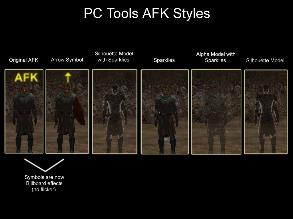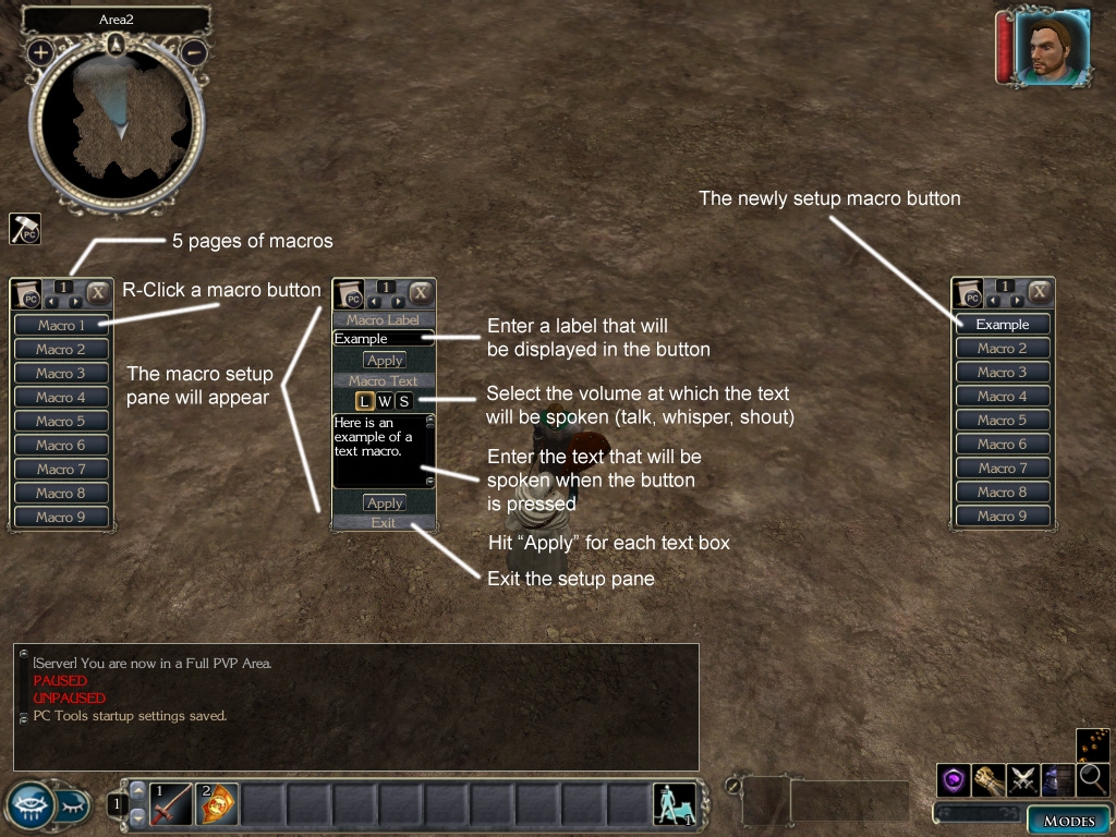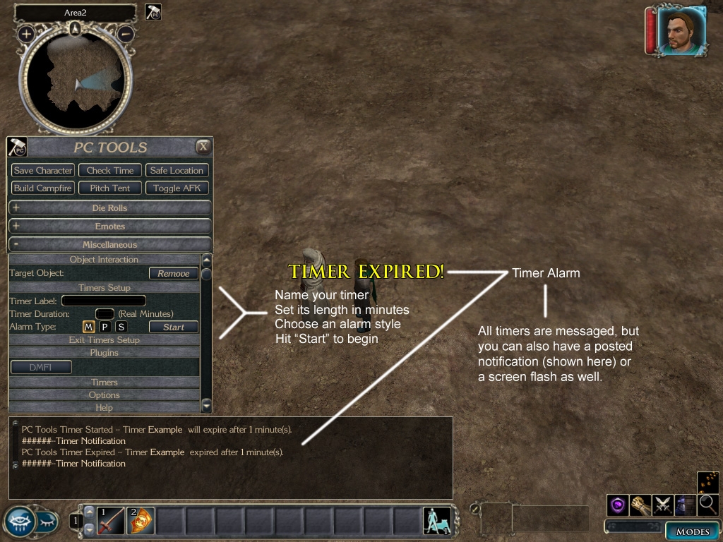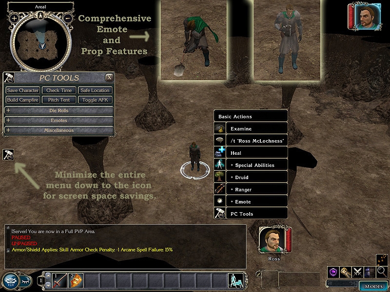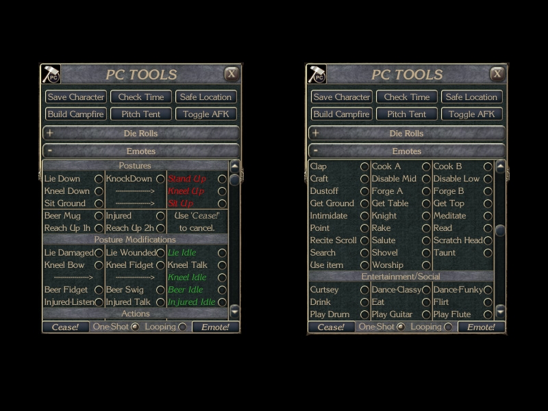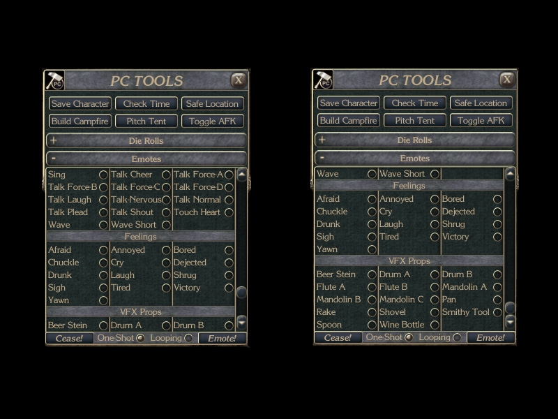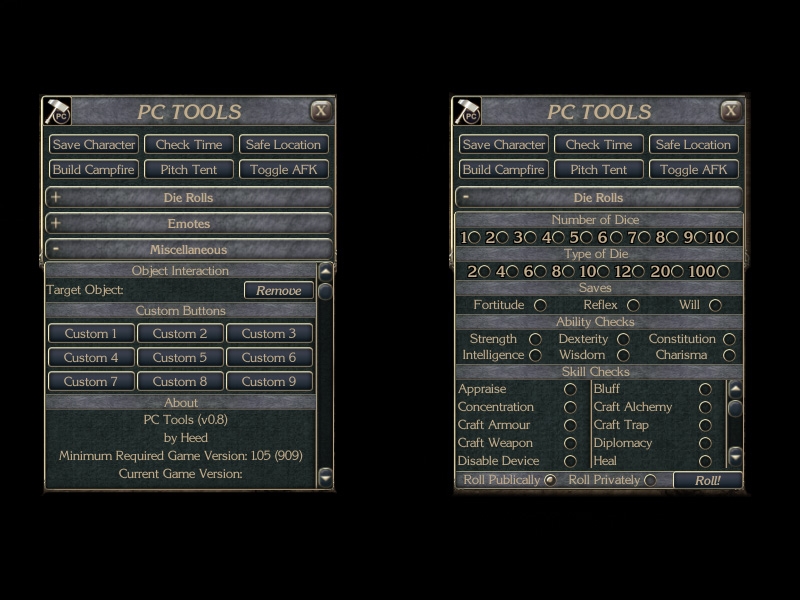 Heed's PC Tools is a GUI driven suite of tools allowing player characters to perform a variety of functions. The majority of the functionality will likely be of most interest to those playing multiplayer games. PC Tools allows players access to common functions such as saving the character, displying an "AFK" visual effect, checking the game date/time, unsticking the character from unpathable locations, creation of campfire or tent objects, a full emote studio including visual effect props such as mandolin, flute, shovel, rake, etc., a dice roll pane for rolling standard die rolls as well as ability, save and skill, 9 custom buttons for end user addition of functionality -- and more! The interface is collapsable down to a core element which can be left open on screen by the player without excessive obscuring of the available screen space. Further minimization can be done so that entire menu collapses into a single icon.