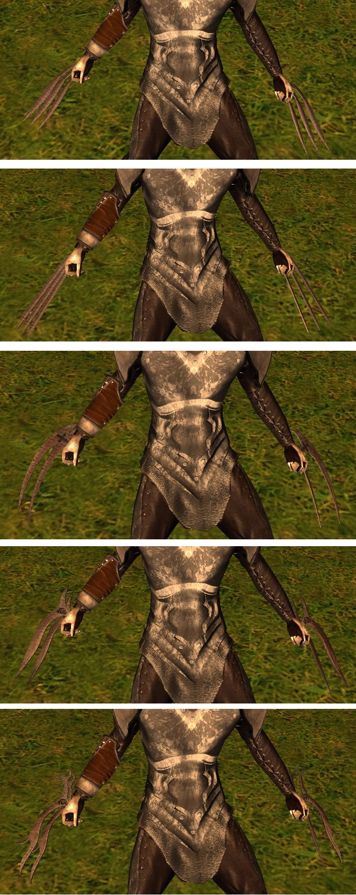 Decided to give up replacing gloves with these and take the bug as is. I don't think this would be a good replacement for kamas either. Since you need to create two different weapons to make a matching set, the players would have chance finding the sister claw so that it looks right in the other hand. Adding one weapon model is one thing. Adding one for each hand seems to be too*bleep*bersome of a job.