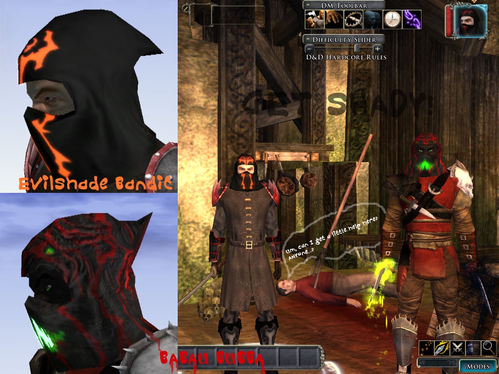 An EvilShade whispered into my ear that the community needs a "Bandit style" hood. Let it be written let it be done. "Get Shady!" override adds two new hoods selectable as cloth helms 70 and 71. EvilShade Bandit (#70) is for all you real ultimate power bandit ninja out there. But if shady shinobi aren't your style, then check out Babau Bubba (#71) for an abyssally inspired Babau skin hood for all your vile villainous needs.