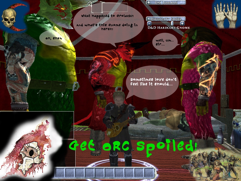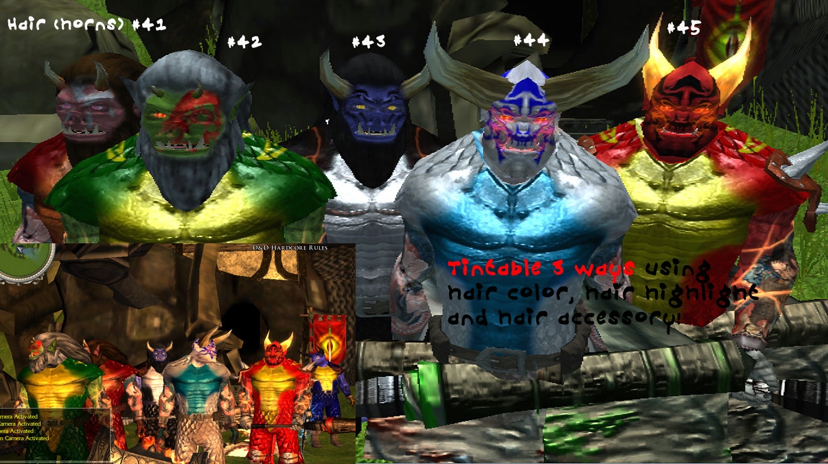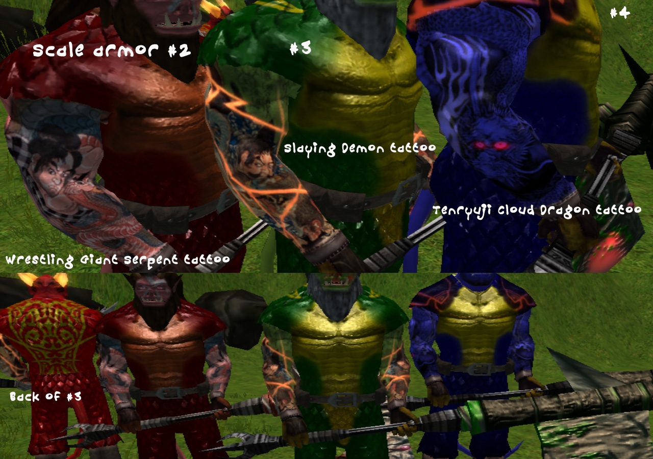 "Orc Spoiled!" adds 5 new heads with tattoos for Half-orc males. It also adds 5 new pairs of horns for Half-orc males, 3 new sets of dragon scale armor with Japanese style arm tattoos, and finally 2 giant sized weapons.