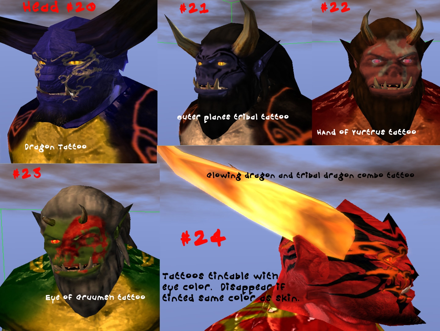The heads i like. But i dont find anything else useful. I could see the heads being used in certain rp situations, maybe a half-orc with demon blood or dragon blood.