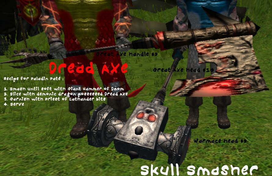 Undeadsteak, you're a bit of a contradiction. Are you sure you're not a tofusteak? Magic is unrealistic my friend. The hammer was designed by obsidian. I just put a handle on it. And of course the axe looks weird...it's a giant sized great axe possessed by a demonic undead dragon! It's useful for someone like a big ass half-orc/half-dragon with a 32 strength ;)