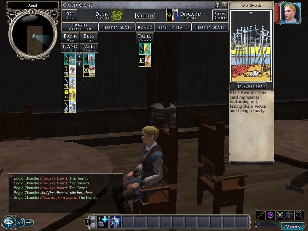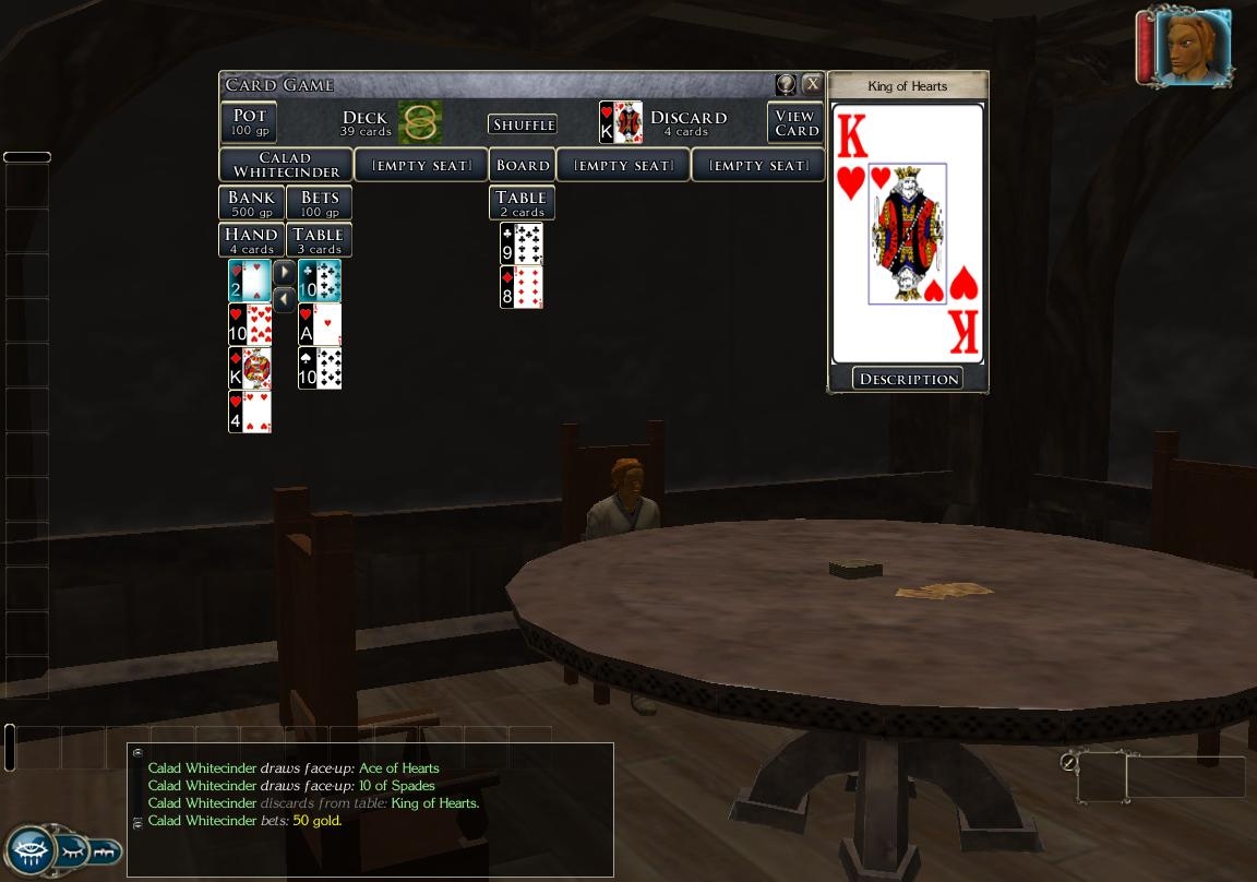 1/22/08: Just uploaded a small bugfix, to solve the problems of the cards in hand not showing up in the close-up view, and the problem of cards being dealt to other players showing up in the close-up view. Simply import the .erf, and overwrite the single script, gui_tkl_cardgame.