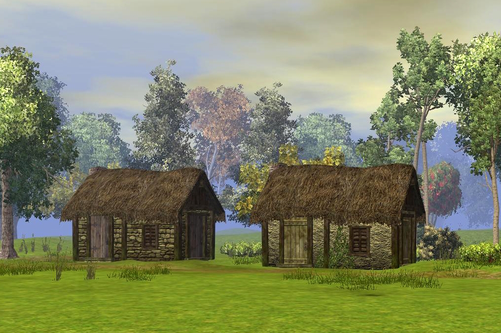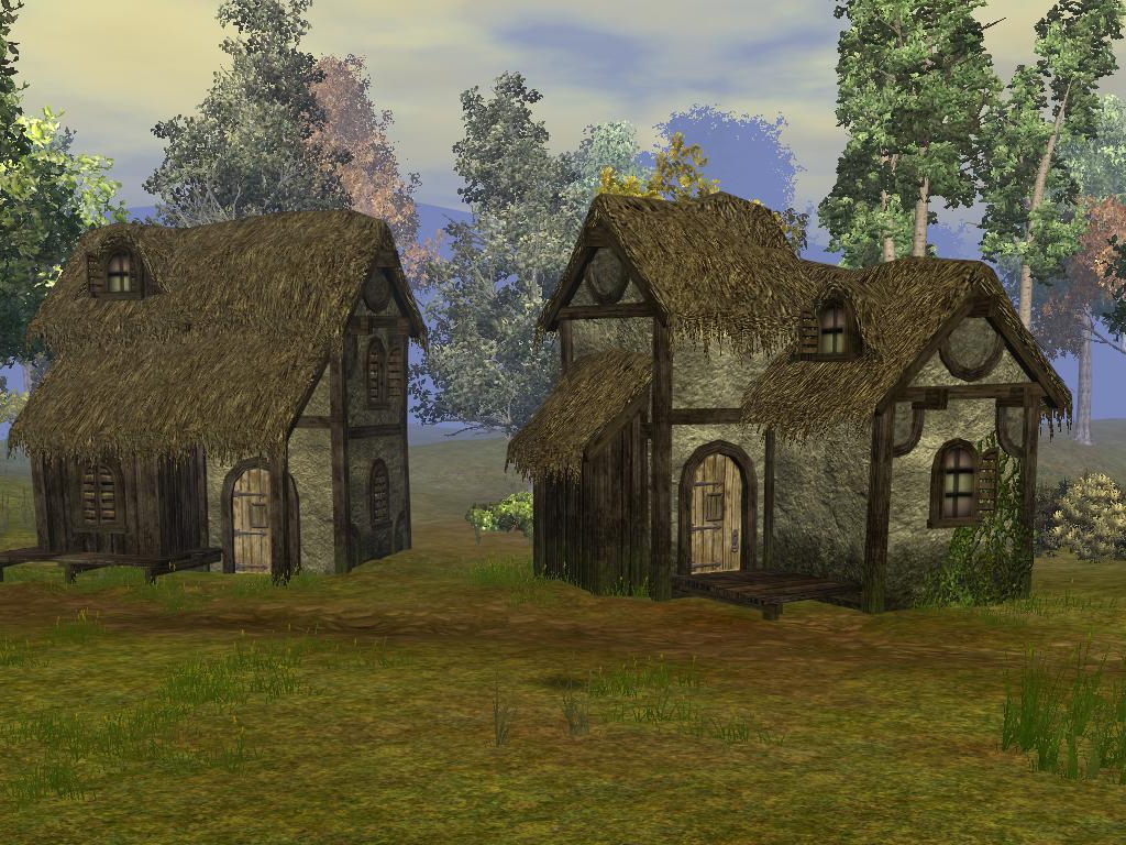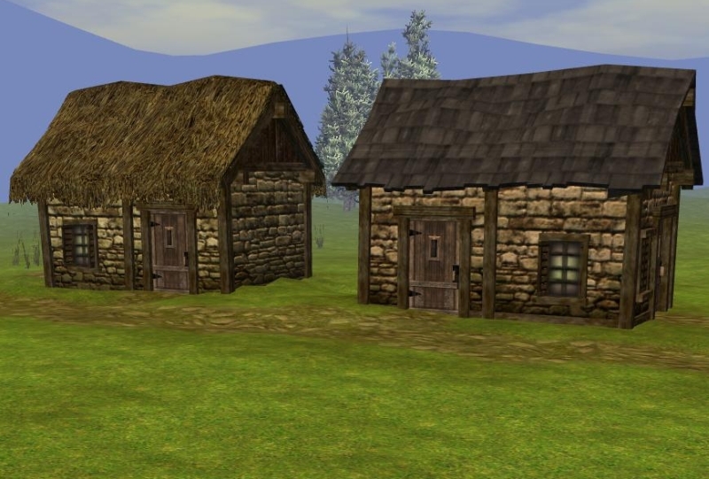 V1.30 A collection of rustic houses with thatch or shingle roofs and stone or earth walls. Each model's roof is tintable and the walls have a two-tone tint.
