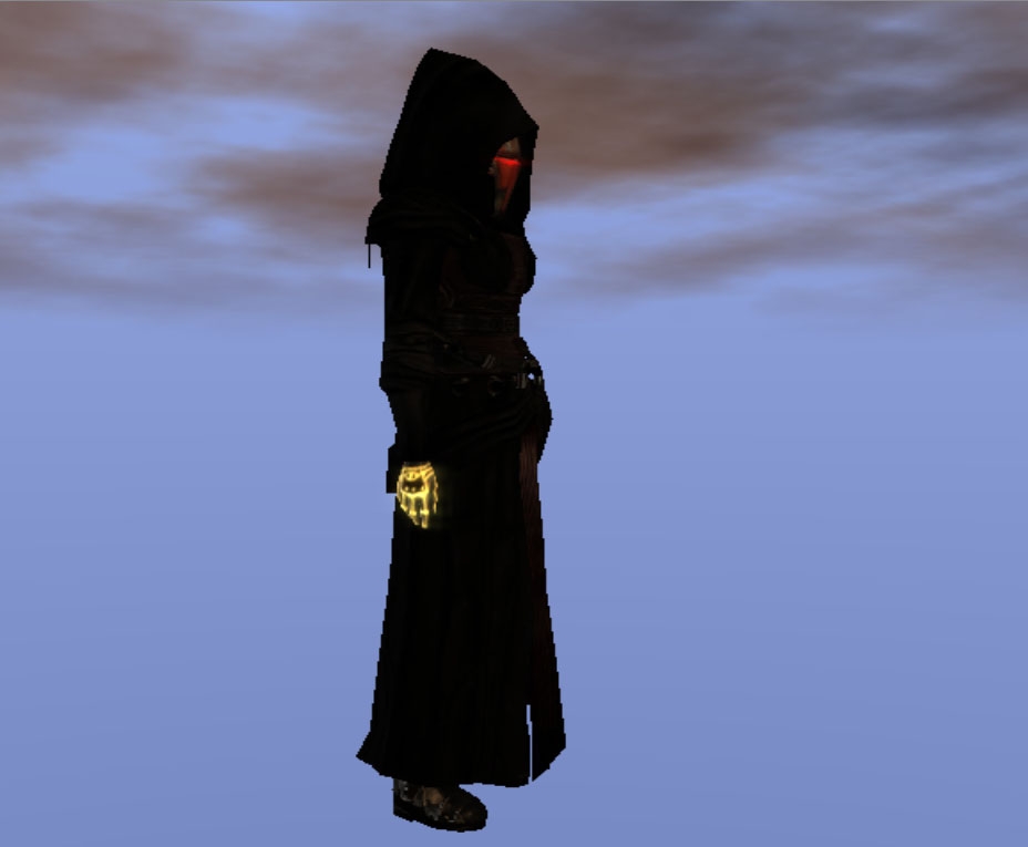 Leather Armor #40- Darth Revan's armor without bracers (converted from KoTOR but heavily modified by me. This armor doesn't override the hair. Nearly every hair style fits under the hood. Many helmets also fit under the hood.).