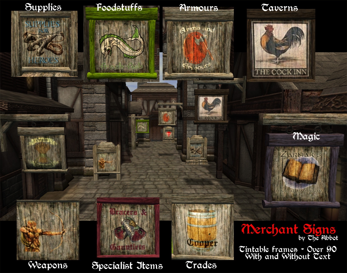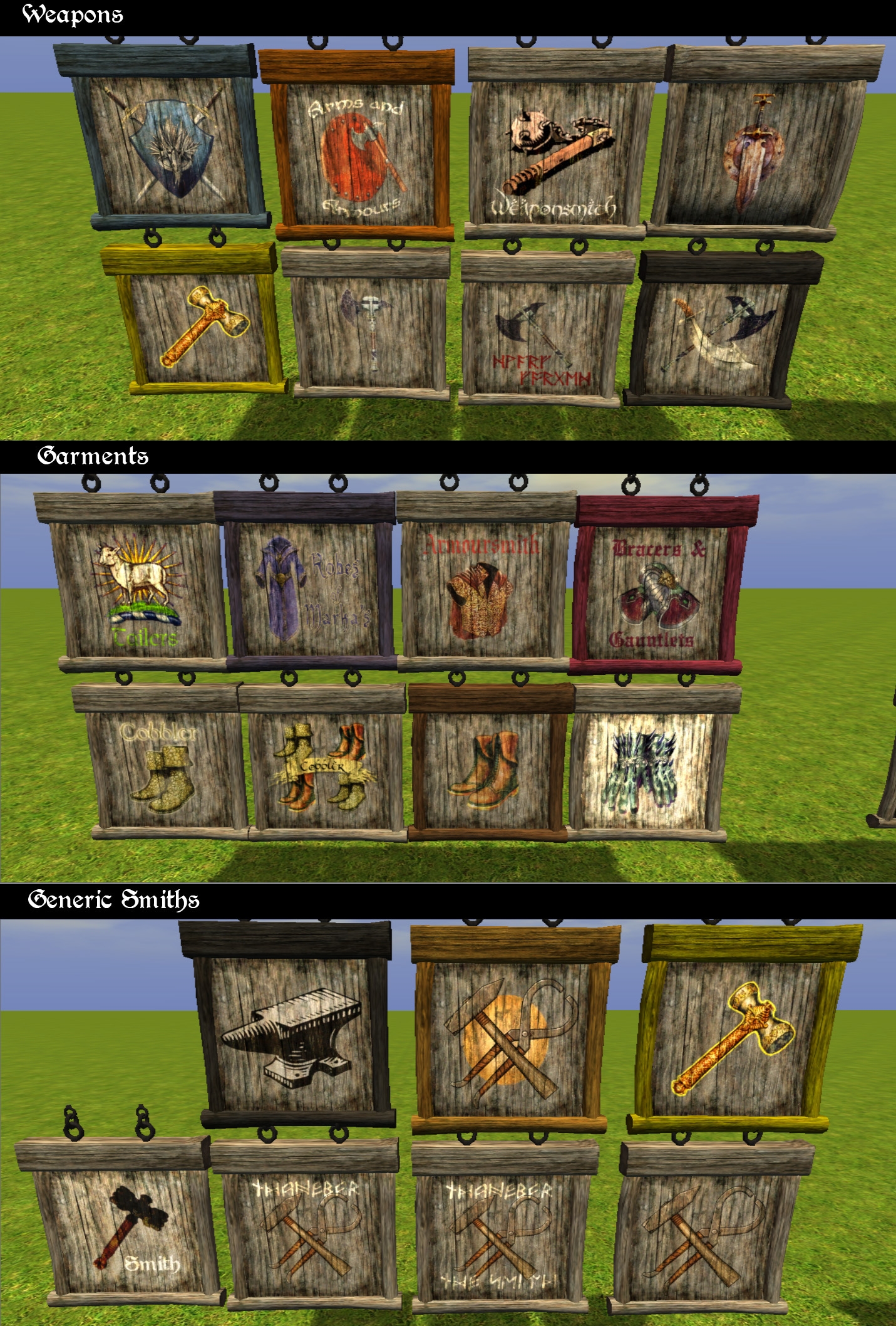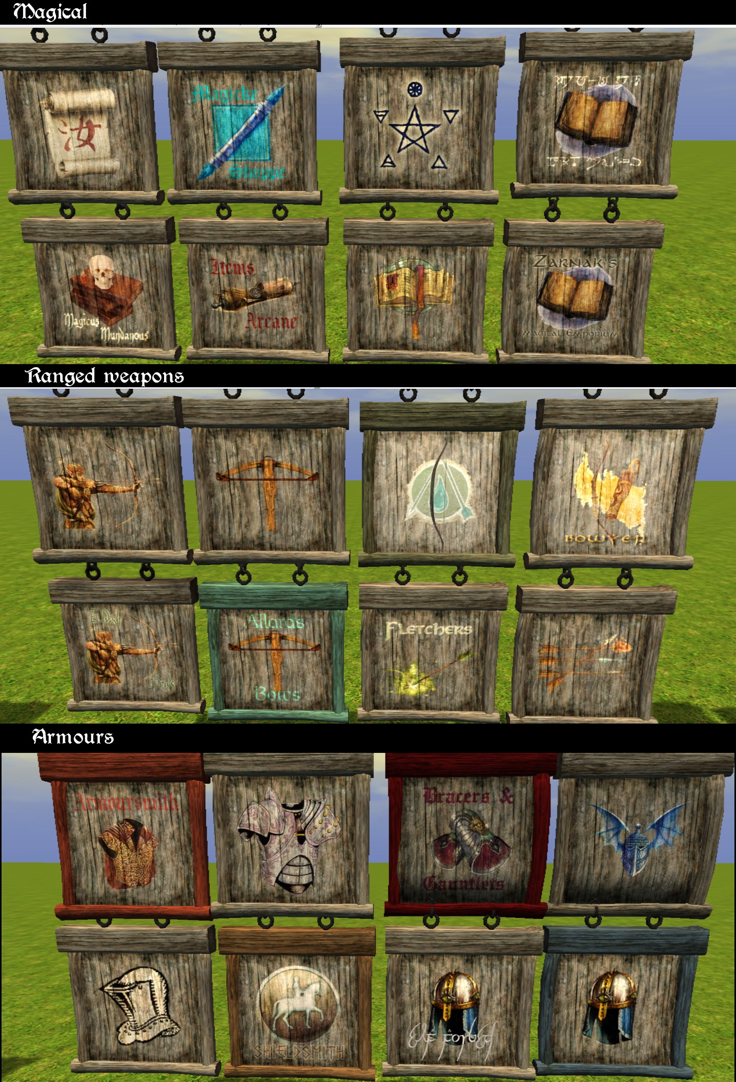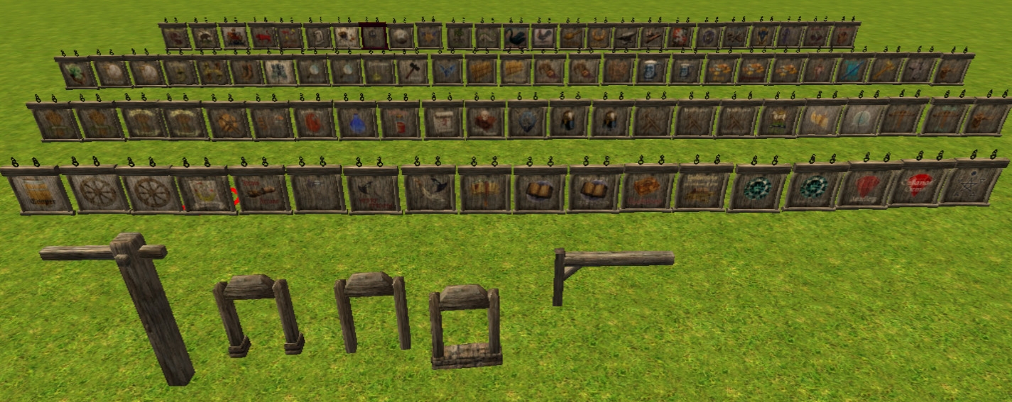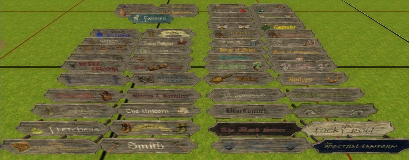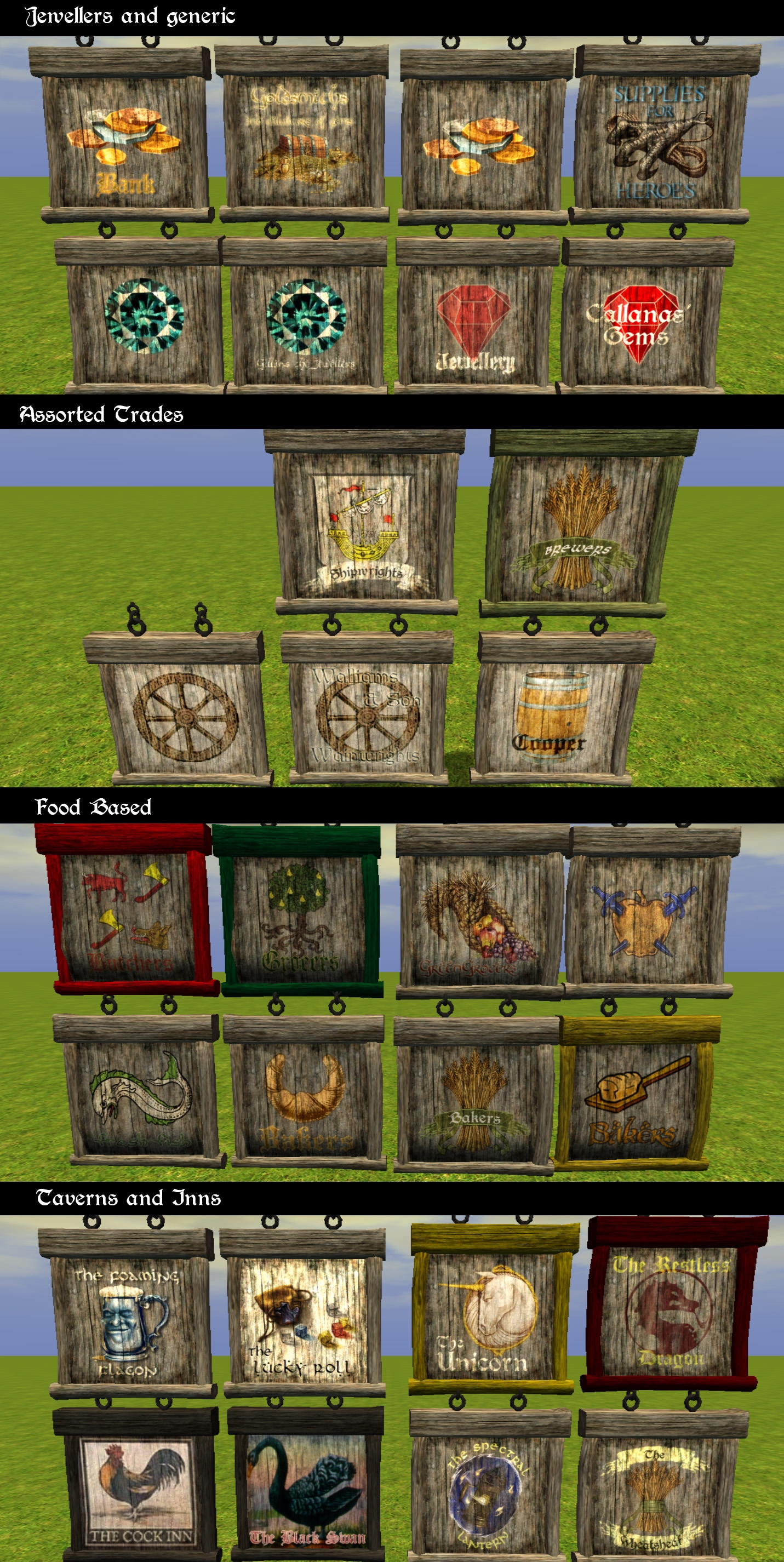 As of v1.1 wall mounted signs are added. These have been generally created to match with the hanging signs - i.e. there is a "Foaming Flagon" hanging sign and a matching "Foaming Flagon" wall mounted sign.
