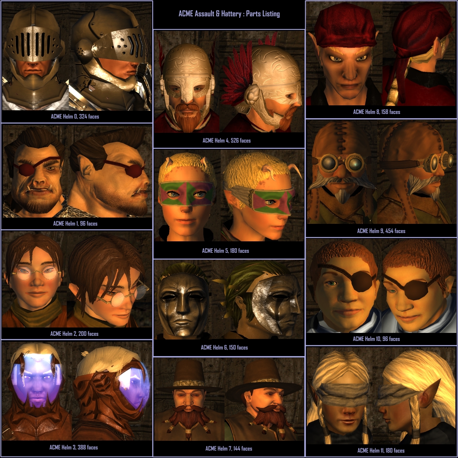 This package provides new helmet parts and face wear VFX for males and females of all races with styles covering the entire spectrum from sci-fi, to steam punk, to high fantasy.