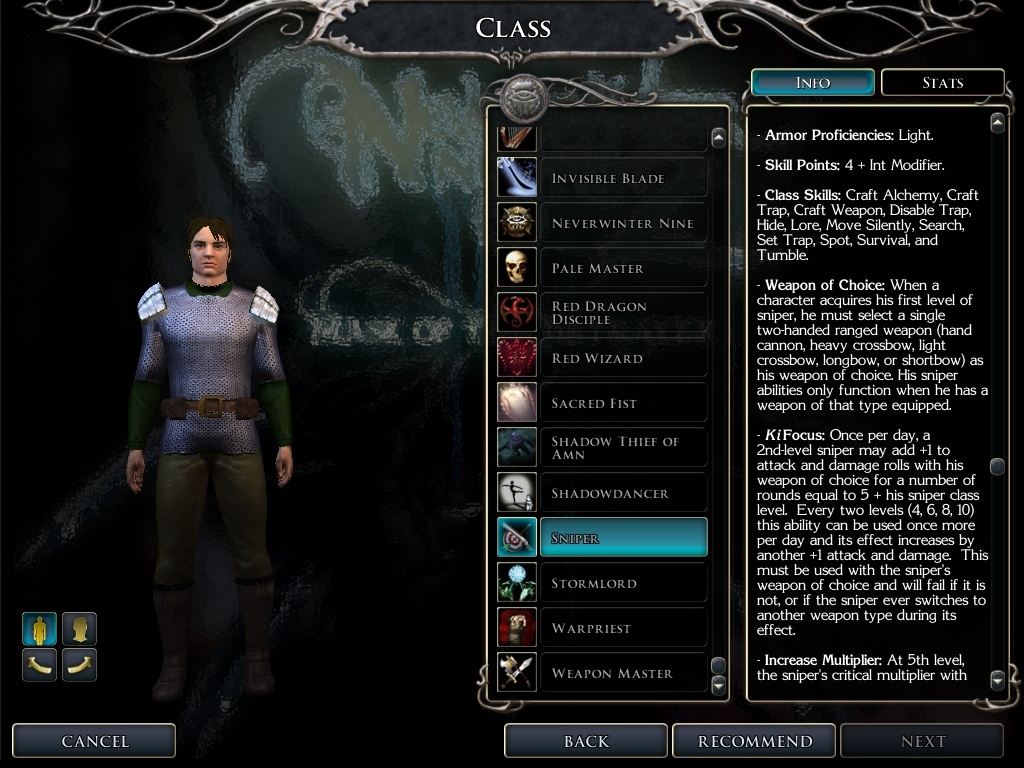 Think ranged combat sucks in NWN2? You're right. I've tried to alleviate that with this pack. Hand Cannons will add some minor power increases if you choose to use them (1d10 18-20 x2 Exotic weapon), but the Sniper class will importantly give you increased critical threat range and damage, as well as Ki Focus for some added power and accuracy. Ranged combat will still be nowhere near as strong as melee, but at least this helps a little.