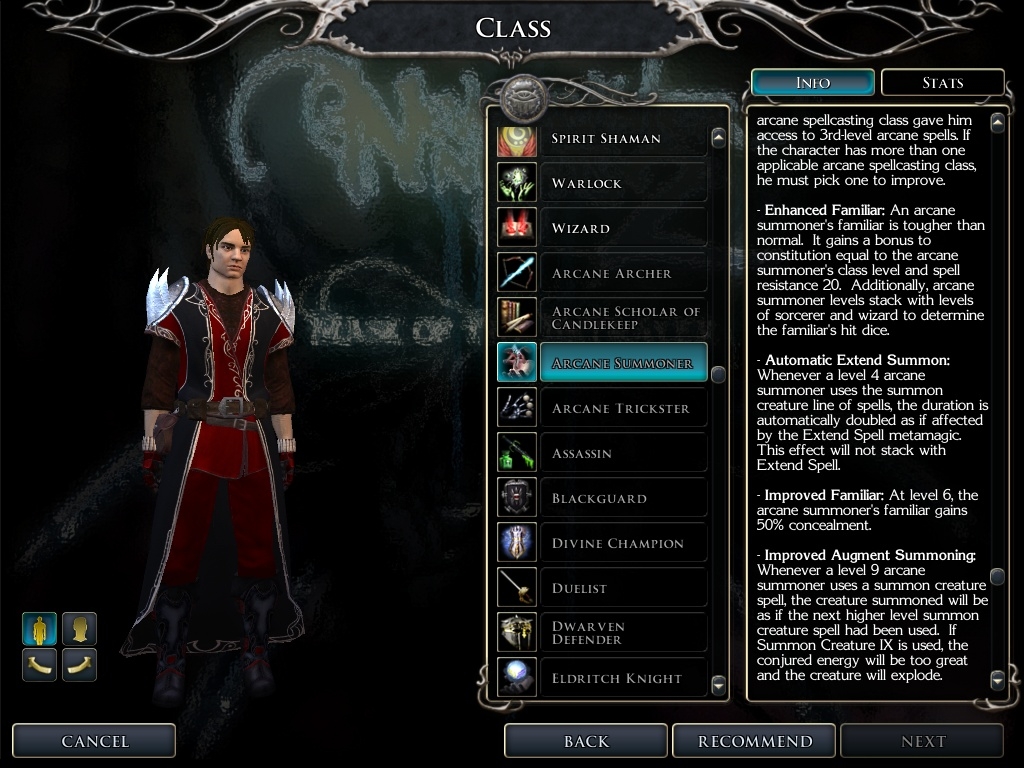 Another prestige class was thrown in now. I'm mostly testing the waters to see how much interest is generated and gauge whether making more classes is worth my time, so let me know what you think. The arcane summoner prestige class is now included, and helps improve the otherwise weak summoning magic of wizards and sorcerers. Its also unique in that your familiar continues to improve in this prestige class, and even gains more power.