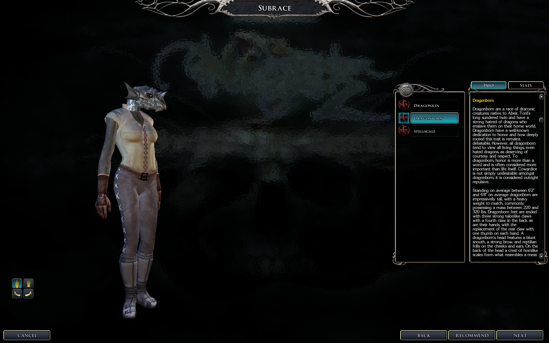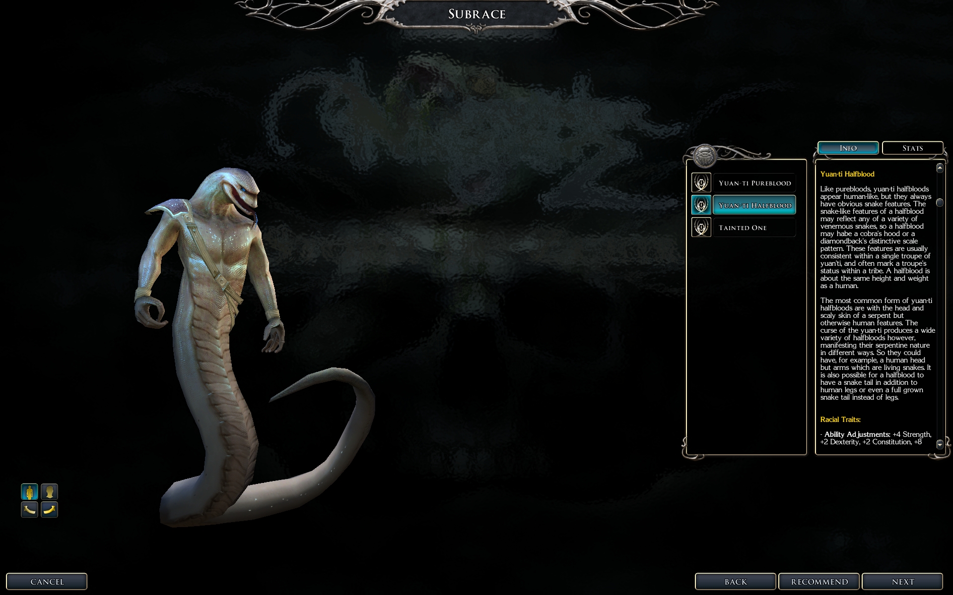 One thing I would love though - Half-Dragons. Or rather, a half-dragon, potentially based on the Yuan-ti Pureblood appearance. I realize that NWN 2 doesn't support templates, so maybe you could include a half-human dragon in the Dragonblood type? I would greatly appreciate it
