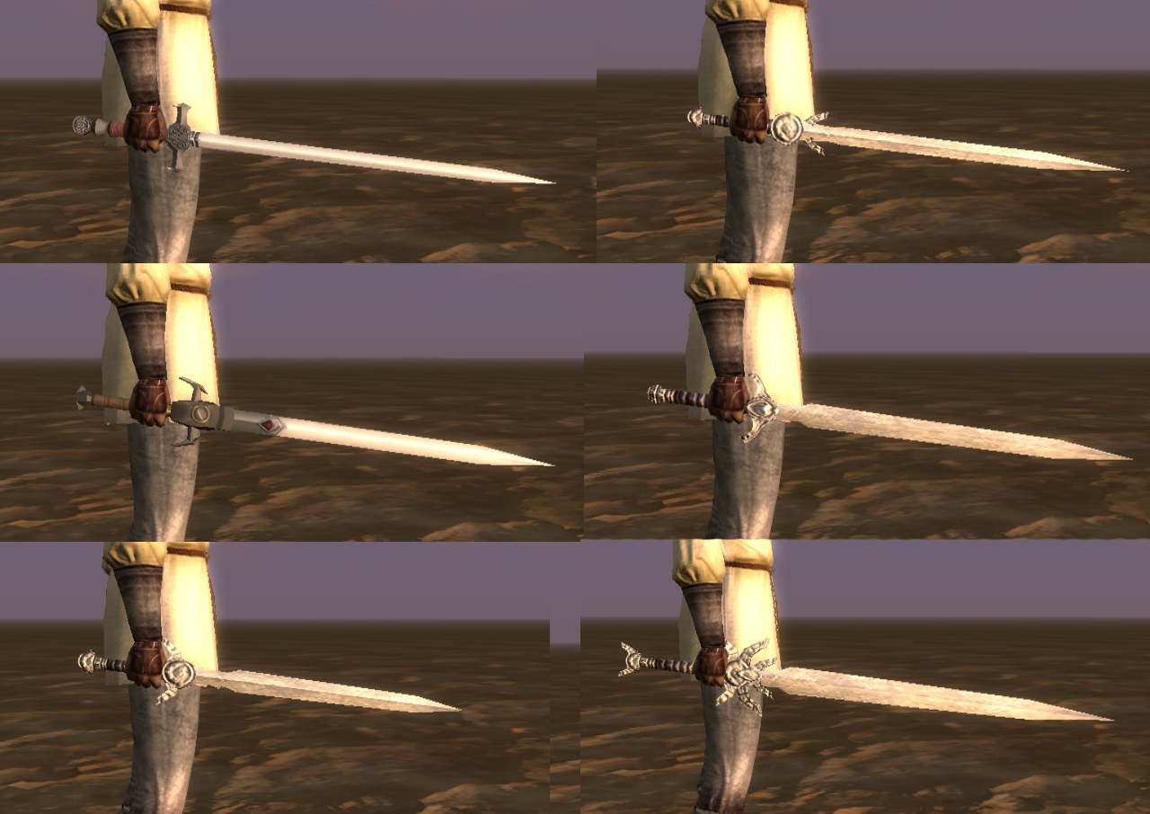 This is just another mini-collection of weapons that I put together last night. It contains 4 longswords, 1 shortsword, 1 bastard sword and 2 rapiers. These weapons were all actually modeled and textured by Obsidian and are part of various placeables in the game (stuck in skeletons, mounted on shields and weapon racks etc.). All I did was a bit of tweaking to make them usable. Enjoy.