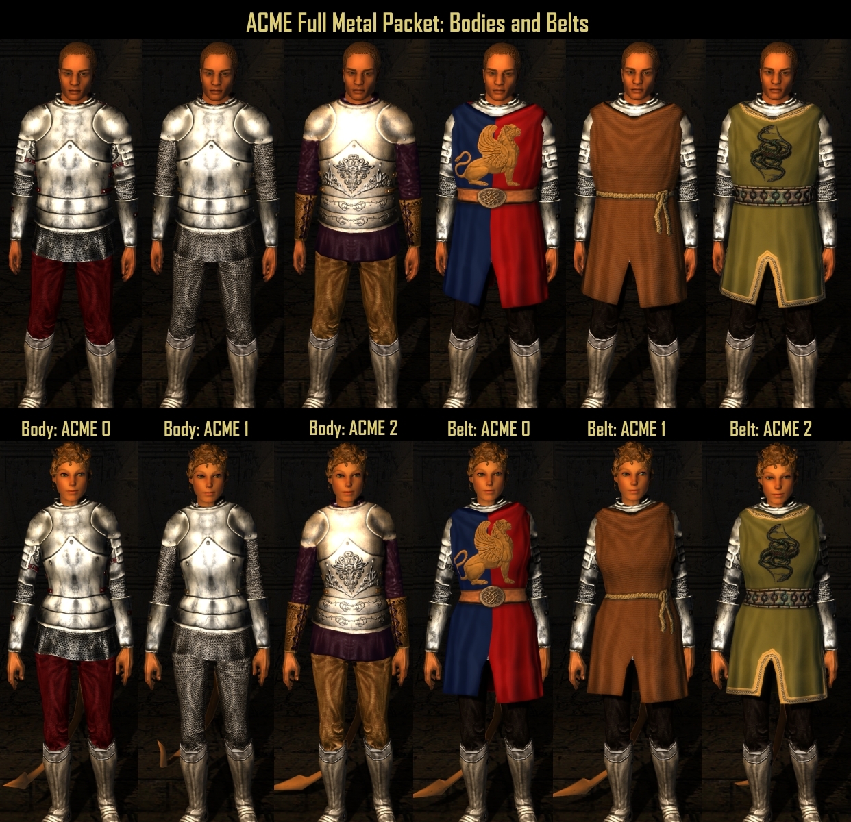 Extract ACME_Tabard_Assets.7z into a working directory and use a 2D drawing program to make your own custom decals for the tabard models. Use MDB Cloner to assign your new textures to the models.