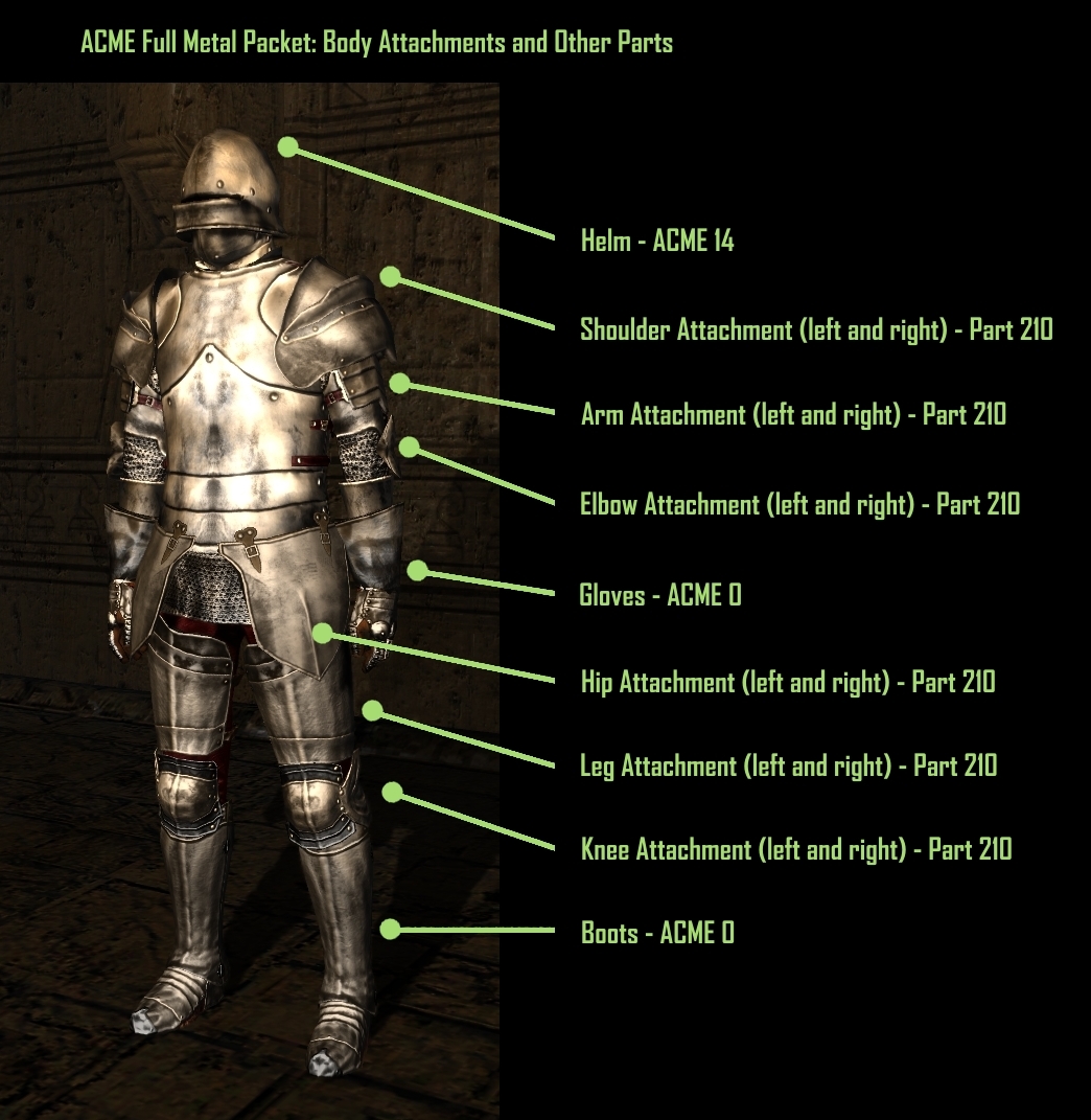 --Body Parts List (Toolset numbers listed): All body parts can be found under the ACME armor type at the end of the armor list.