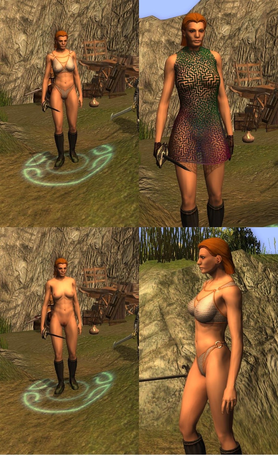 Ardells work on the Blender scripts reignited my interested in doing something for NWN2 - so I figured I revisit my first project - chainmail bikinis (hey, a guy's got to have an obsession...) I soon found Zylch's nude a bit restrictive and so did my own. It's got a few more polys than the original, but I think it looks better for it. Look at the hands and feet - no seams! (Only possible thanks to Ardell)