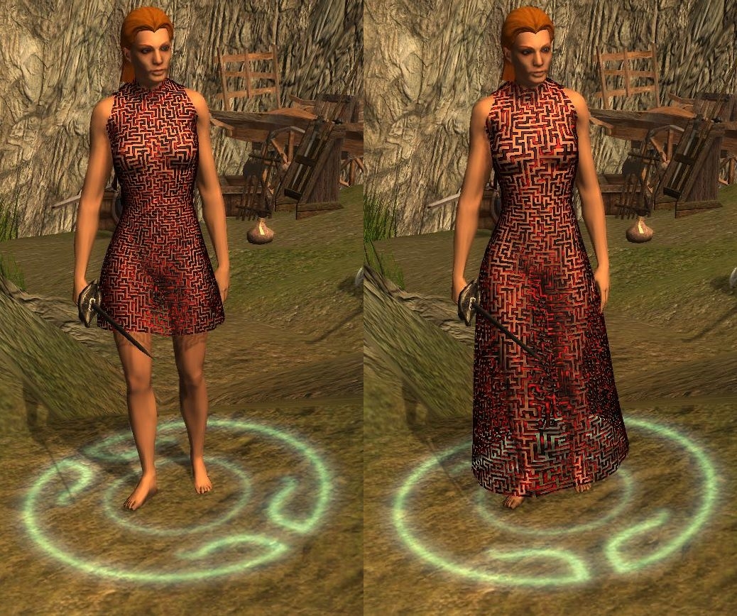 Well that was a nightmare - there is very bad mesh stretch when running on the front and back of the dress - confined to the centre panels. This seems to be unavoidable - all the original dresses suffer from it as well. I strongly advise leaving a slit in the dress if you want it to be used by a player (who will be running everywhere)