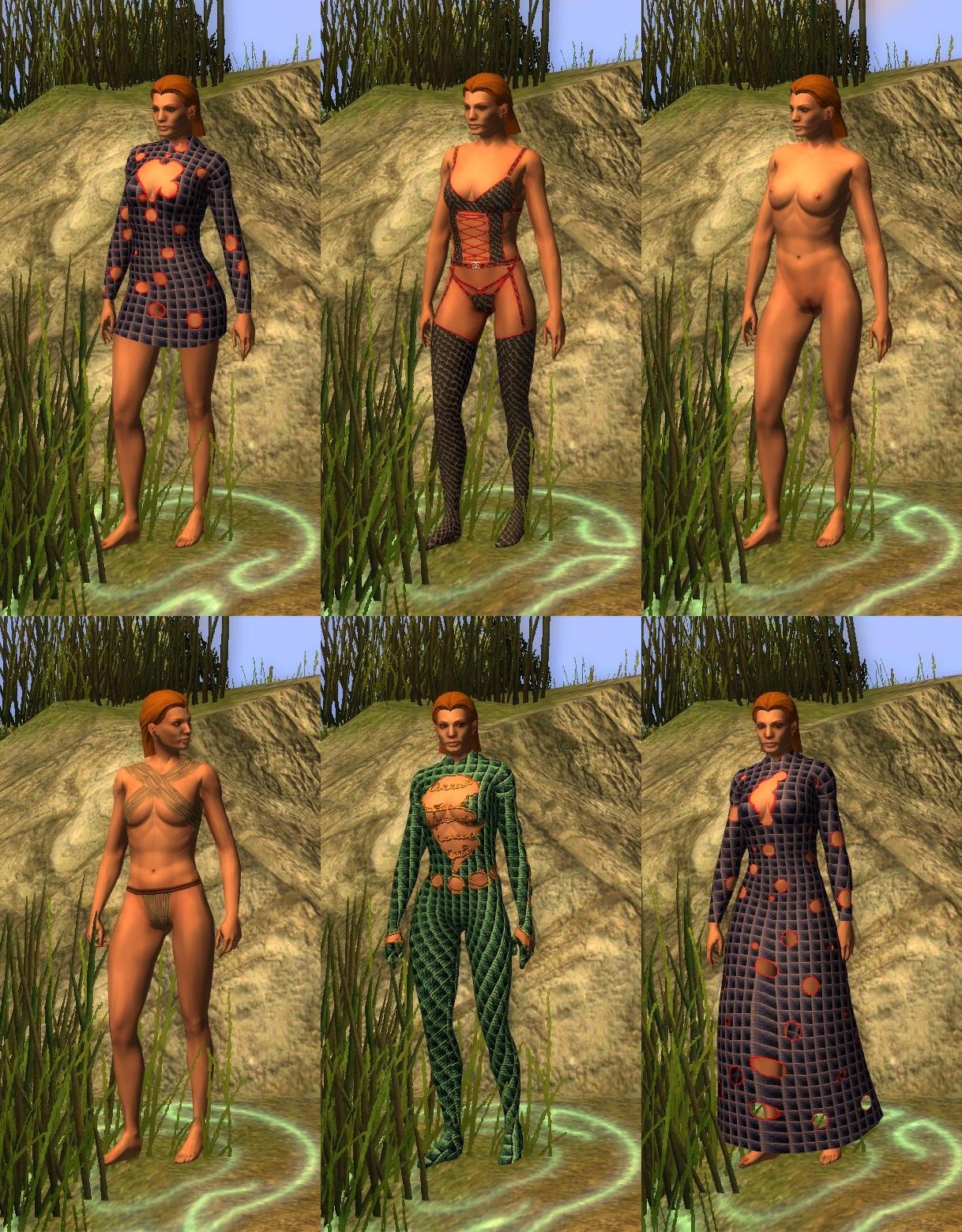 Dalamar: If you look at some of the costumes (naked*) in the toolset you'll see what I mean. To change the textures simply open the .dds file in Gimp (free plugin needed), edit, and save.