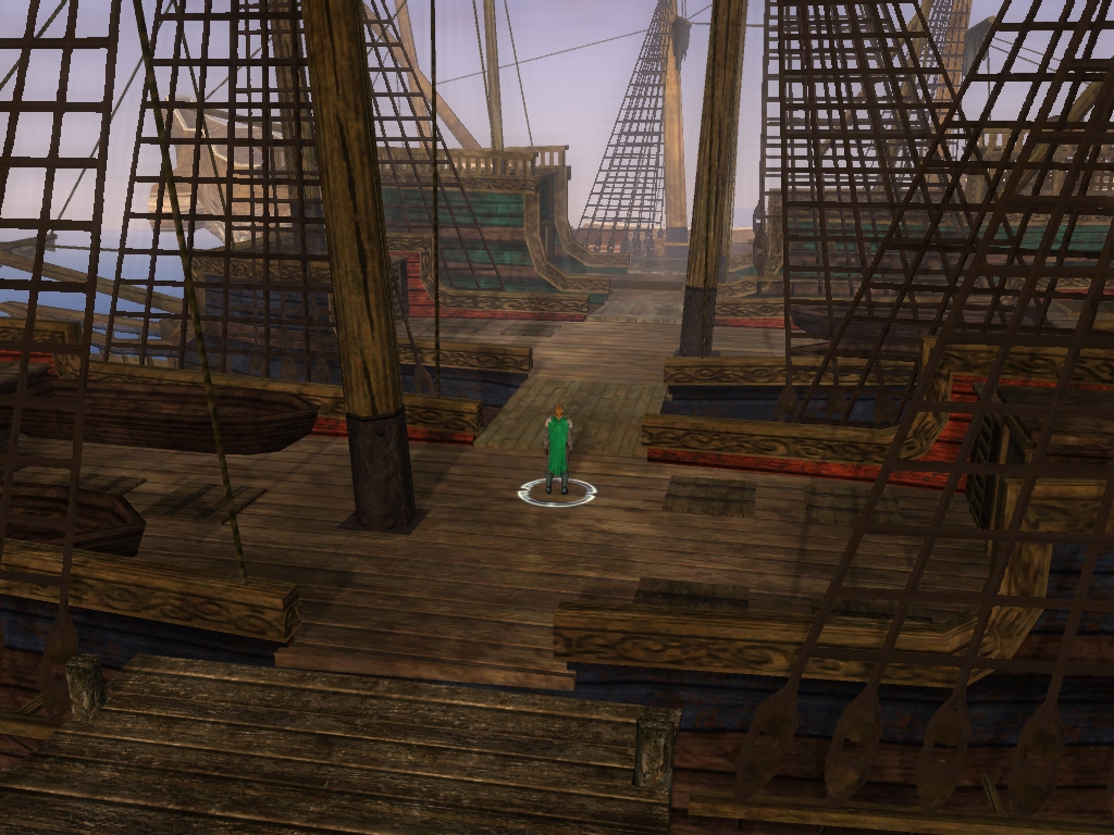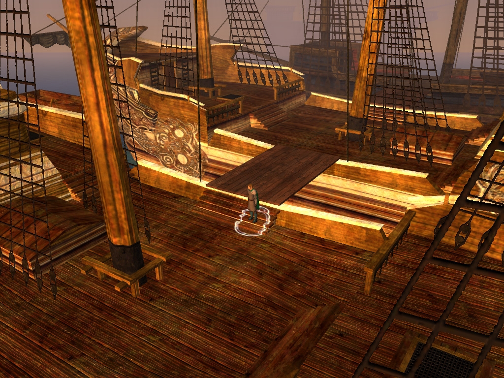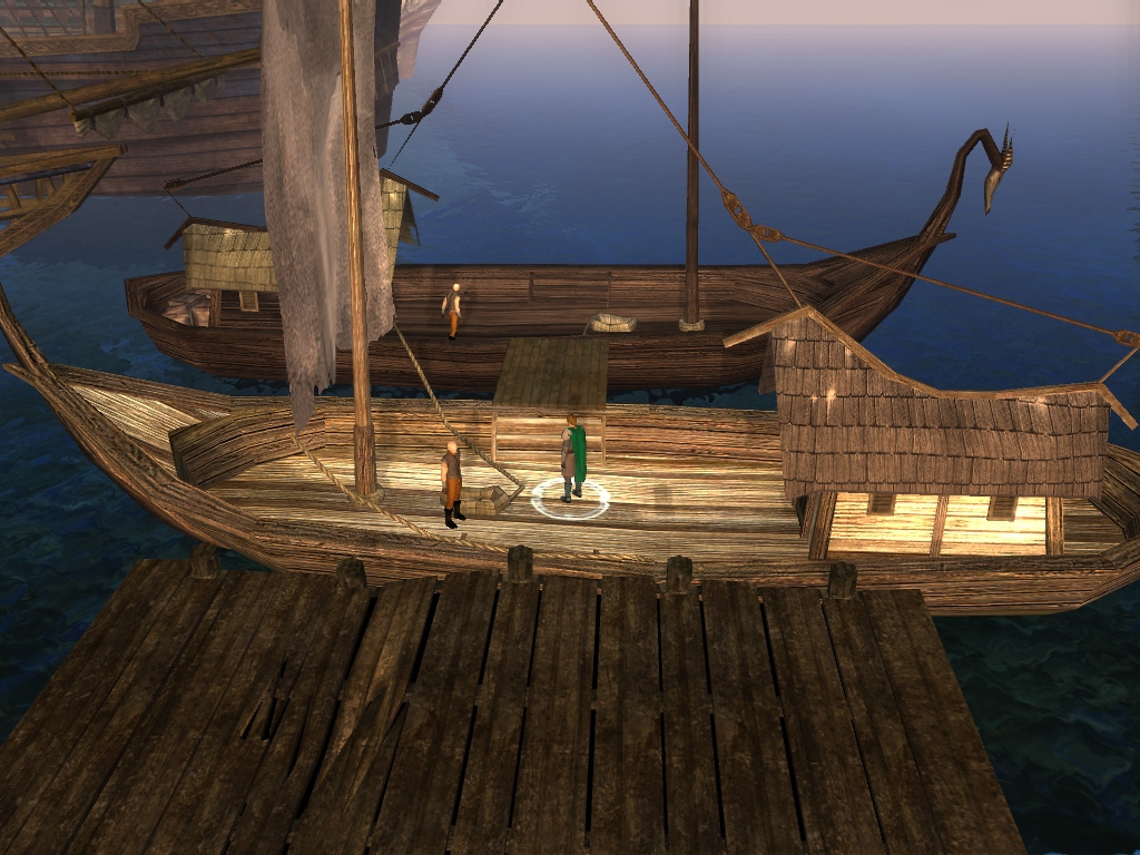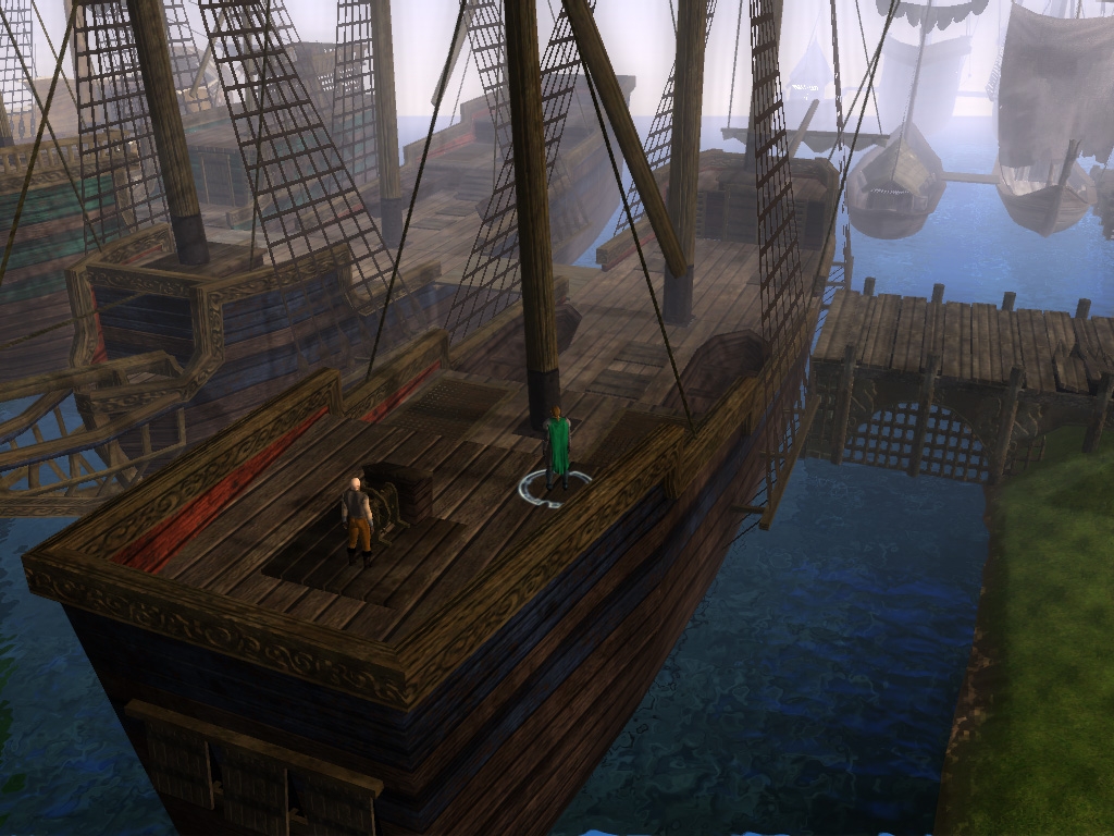 Heed's Boardable Ships is a custom content package (hak pak) that provides ship models and accessories based on the official Obsidian ship models. The models provided in this hak differ from the default ones in that they can be baked and can be walked upon. There are some other minor differences in cosmetic appearance. For instance, the cargo ship's wheel has been moved to the uppermost deck and a beam is placed below it to show some sort of linkage between the wheel and the the rudder. This was done mostly because the upper deck is walkable now and the position the wheel was in originally is not. It just seems wrong to be able to walk on a ship and not be able to stand behind the wheel or converse with someone who is manning the wheel.