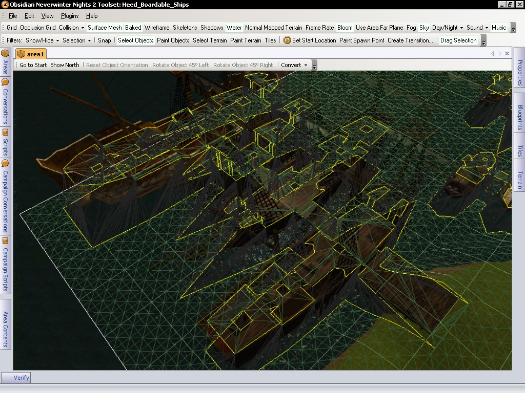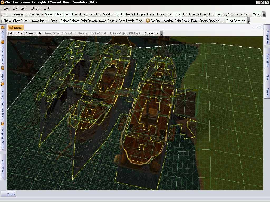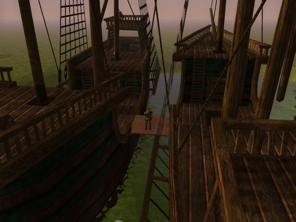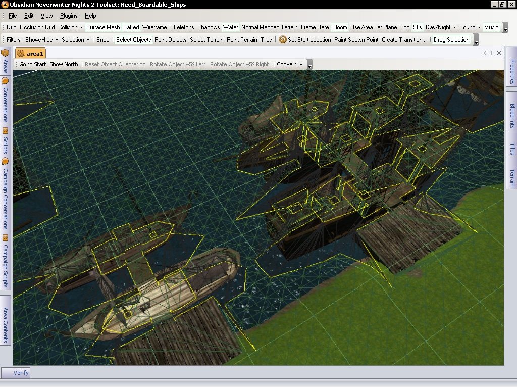 Heed's Boardable Ships is a custom content package (hak pak) that provides ship models and accessories based on the official Obsidian ship models. The models provided in this hak differ from the default ones in that they can be baked and can be walked upon. There are some other minor differences in cosmetic appearance. For instance, the cargo ship's wheel has been moved to the uppermost deck and a beam is placed below it to show some sort of linkage between the wheel and the the rudder. This was done mostly because the upper deck is walkable now and the position the wheel was in originally is not. It just seems wrong to be able to walk on a ship and not be able to stand behind the wheel or converse with someone who is manning the wheel.